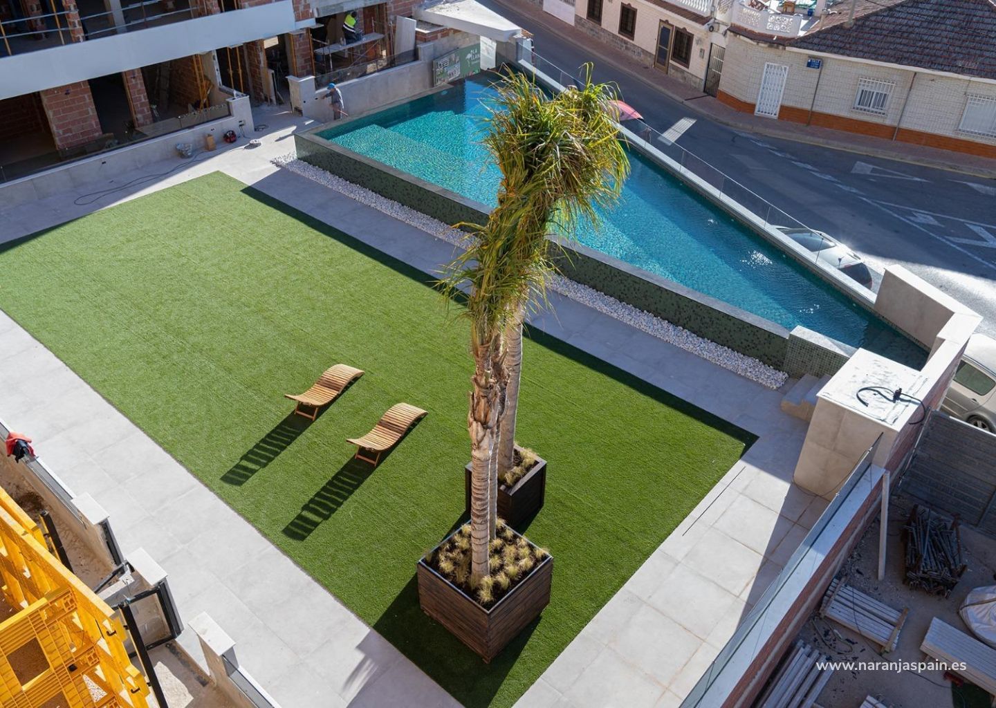 Beautiful communal garden area whit artificial grass and Infinity pool with heat pump.
