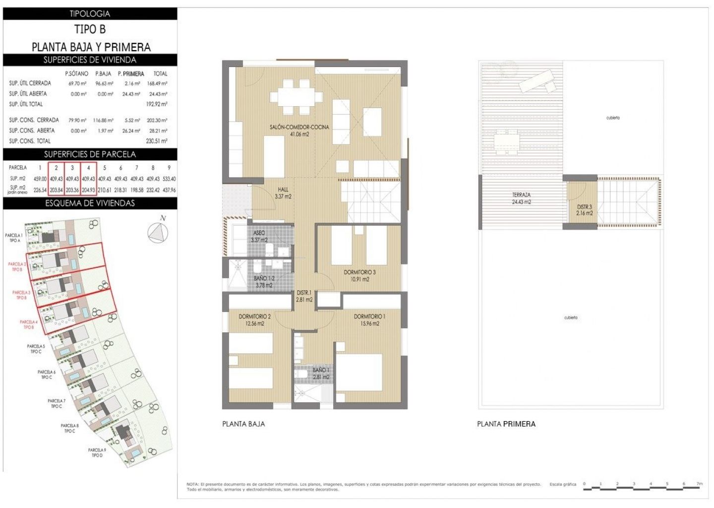 All villas has 3 bedrooms, 2 or 3 bathrooms, open plan kitchen with lounge, build-in wardrobes, air conditioning and aerothermal, equipped kitchen, private garden with pool and parking.