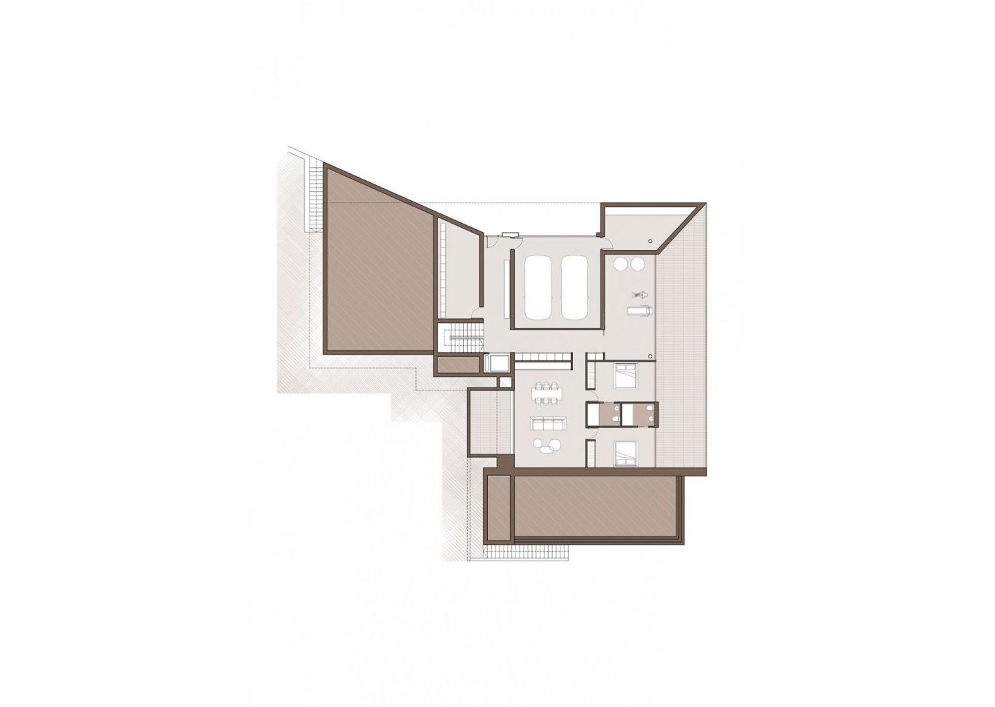 Villa articulates the interior spaces through simple, pure and emphatic geometries. It is accessed through a ramp and stairs integrated into the ground, supporting the upper part of the house on a stone plinth that gives entrance to the living place.
