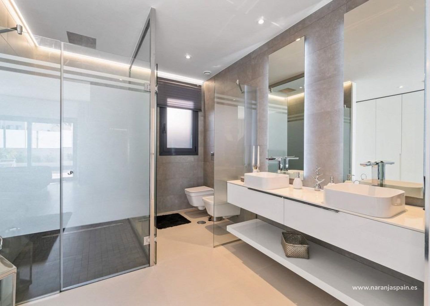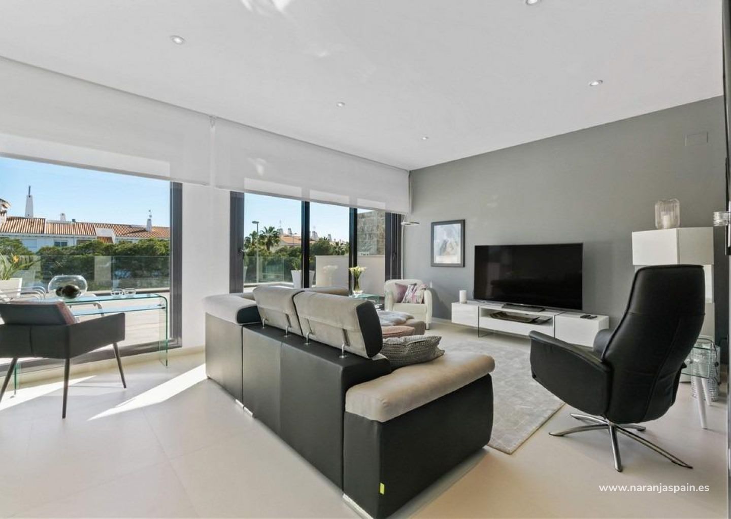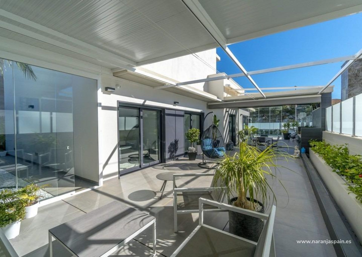 Magnificent luxury villa located in Dehesa de Campoamor just 300 m from the beach. Built on a 500 m2 plot, it has a constructed area of 200 m2. Distributed on two floors: on the ground floor we find the large living-dining room, open-plan kitchen, 2 bedrooms, 2 bathrooms, porch. On the first floor there is one more room, bathroom, half-covered solarium with jacuzzi and relaxation area. Views of the sea and surroundings from the solarium. Equipped with underfloor heating, central air conditioning installed, parking on the plot. Private heated saltwater pool. Southeast orientation. Sold furnished and equipped. It has a perfect location: 50 m from a supermarket, pharmacy, 200 m from a wide variety of bars and restaurants, promenade and the beaches of Campoamor 300 m away.