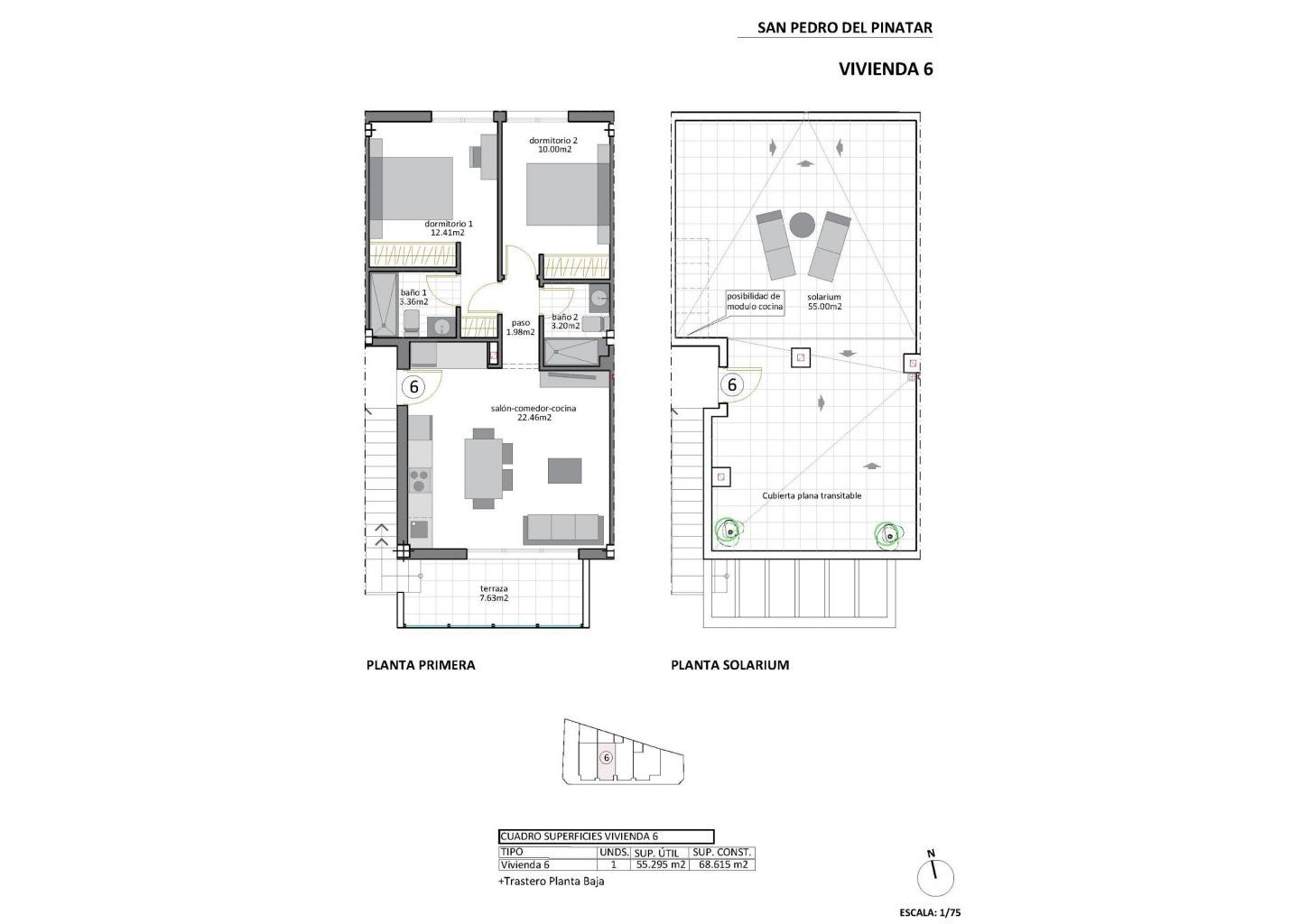 New Build Bungalows in San Pedro del Pinatar – Prime Location Just 500m from the Beach Exclusive Boutique-Style Homes Near the Coast Discover these elegant new construction bungalows in the heart of San Pedro del Pinatar, just 500 meters from the stunning beaches of the Mar Menor. This boutique development includes only eight signature homes, combining modern design, comfort, and a tranquil coastal lifestyle. Available Models to Suit Your Lifestyle Garden/Ground Floor Model: Features a front terrace and a spacious rear patio, perfect for outdoor living. Penthouse Loft Model: Includes a private rooftop solarium and a front terrace, offering open views and an abundance of sunlight. Garden/Ground Floor Model Details Step into a bright living space that seamlessly connects to the dining area and a fully fitted kitchen. Large sliding glass doors let in natural light, creating an open and inviting ambiance. The layout includes two spacious bedrooms, with the master bedroom boasting an en-suite bathroom, as well as a modern family bathroom. Penthouse Model Highlights Access the penthouse via a private staircase leading to a large terrace. Inside, an open-plan lounge and dining area blend with a fully fitted kitchen. Two bedrooms are included, with the master bedroom offering an en-suite. A private rooftop solarium, accessible from the kitchen, provides an ideal spot for relaxation or entertaining. Additional ground-floor storage ensures convenience. Key Features and Amenities Internal and external LED lighting. Fully fitted kitchen with induction hob, oven, dishwasher, and fridge/freezer. Air conditioning installed. Designated parking space. Landscaped communal garden with a swimming pool for residents. San Pedro del Pinatar: Coastal Charm and Convenience Located on the beautiful Mar Menor and Mediterranean coastlines, San Pedro del Pinatar is a haven for watersports, sailing enthusiasts, and beach lovers. The nearby Lo Pagán area offers natural mud baths, calm waters, and year-round amenities, including shops, restaurants, and leisure facilities. Distances to Key Points of Interest: Dos Mares Shopping Center: 5 km Murcia/Corvera Airport: 30 km Alicante Airport: 75 km Local golf courses: 10–20 km Marina and sailing clubs: 2 km Reserve Your Dream Home Today With completion scheduled for late 2025, now is the perfect time to secure your new home in San Pedro del Pinatar. Don’t miss this opportunity to enjoy a blend of modern elegance and coastal tranquility. Contact us today to learn more or arrange a visit!