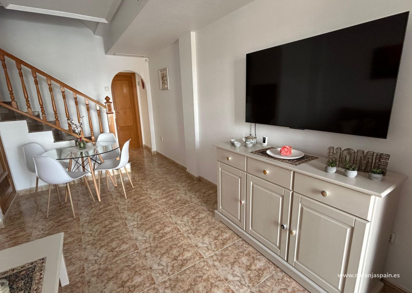 It has two bedrooms with a full bathroom, a spacious living-dining room with a sofa bed.