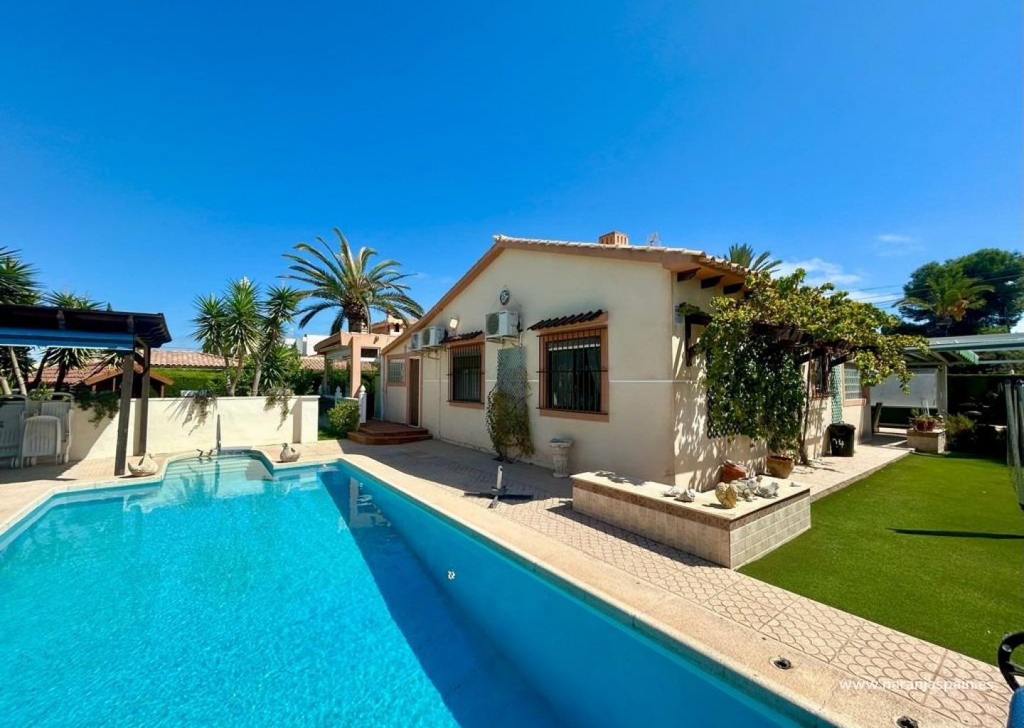 We present this beautiful single-story villa in Cabo Roig! Located just 10 minutes from the beach, in one of the most sought-after areas of the Orihuela Costa. Built on a plot of approximately 800 m², this property has 140 m² of built area, a large garden, a private pool, a wooden garden house, and a pergola. It's the ideal space to relax and enjoy unforgettable moments with family and friends.~The home features 3 bedrooms, 3 full bathrooms, a separate kitchen with access to the garden, and a spacious and bright living-dining room with a fireplace. All on one level. There's a glazed terrace with a summer kitchen and barbecue. There's also a closed garage. The garden is well-kept with various plants, trees, and artificial grass.~The home is in very good condition and is ready to move into.~Perfect for year-round living. All amenities are within walking distance, and Cabo Roig beach is a 10-minute walk away.~