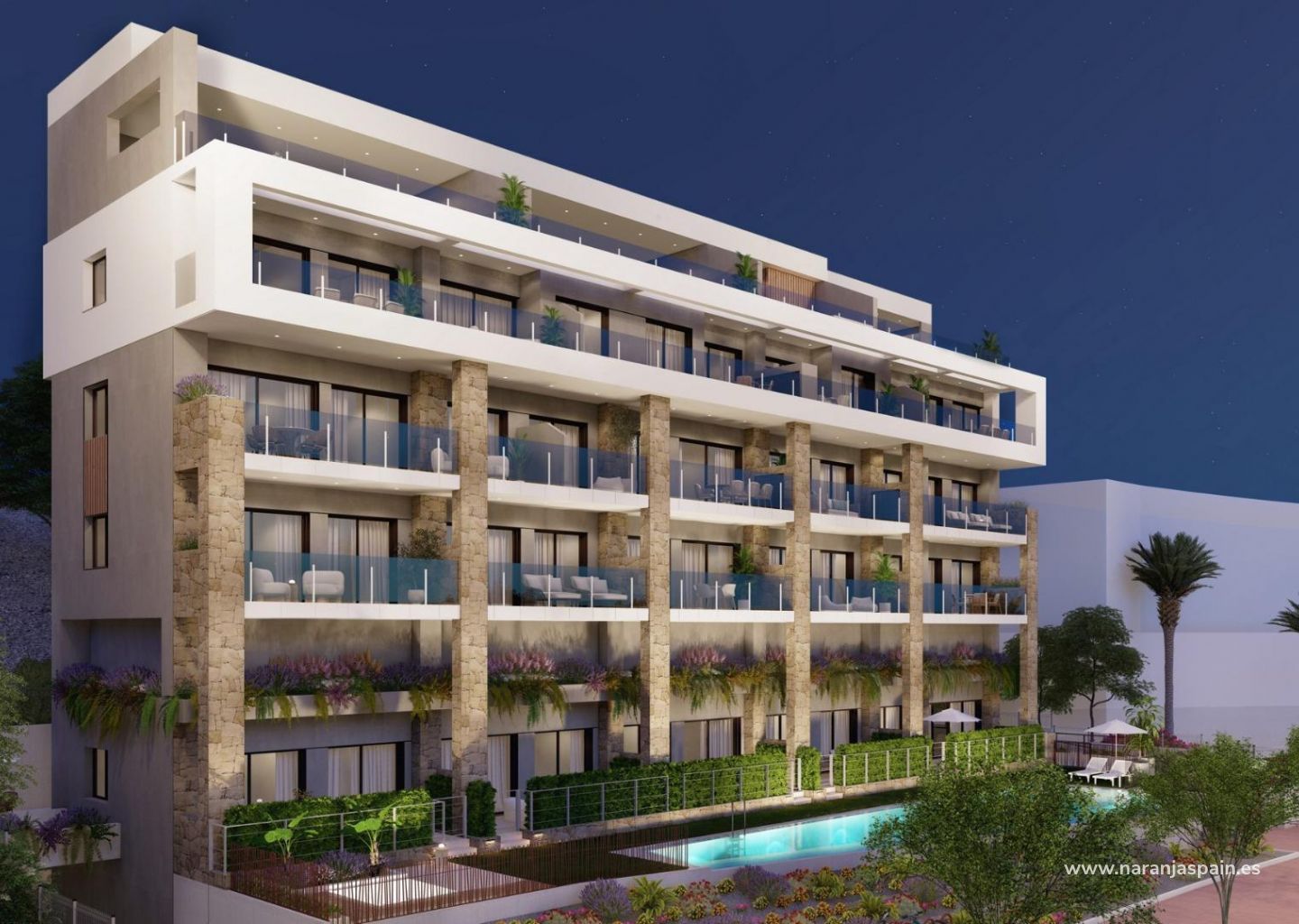 This boutique development offers 1- and 2-bedroom apartments with large terraces, private gardens on ground floors, or solariums in the penthouses. Each home is designed with a modern Mediterranean style, combining natural materials, soft colors, and clean architectural lines that blend seamlessly with the coastal surroundings.