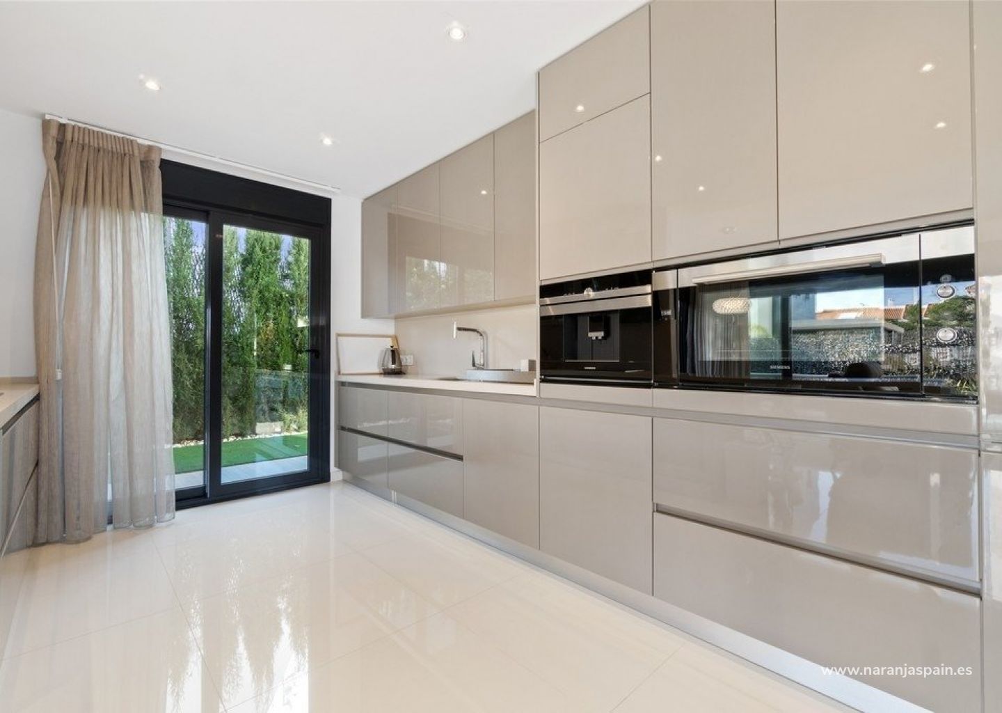 Modern style luxury villa located in Campoamor, only 300 m from the beach. Villa with an area of 200m2, built on a plot of 500m2, the house has 4 bedrooms, 3 bathrooms, living room, kitchen, terrace and solarium of 46m2 with sea views. The outside part has a private pool 8x4. Underfloor heating in the bathrooms, centralized air conditioning installed, parking on the plot. Top quality materials. Heated saltwater pool. It is close to all services, schools, just 10 minutes by car from the largest shopping center in Alicante, Zenia Boulevard, 40 minutes from Alicante airport and a few minutes from some of the best golf courses.