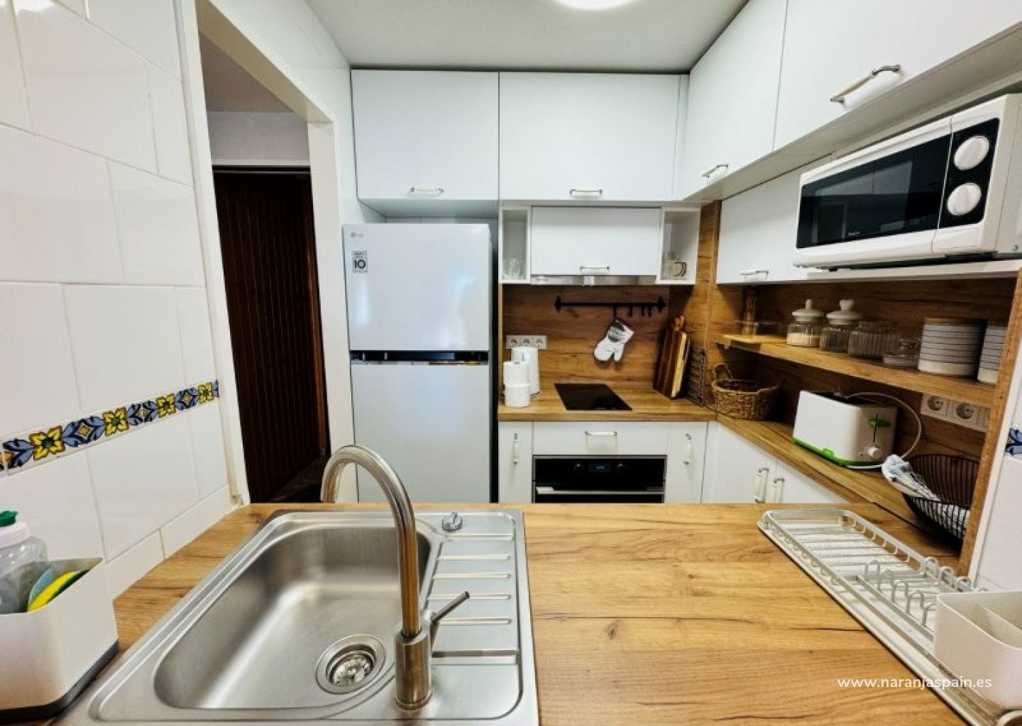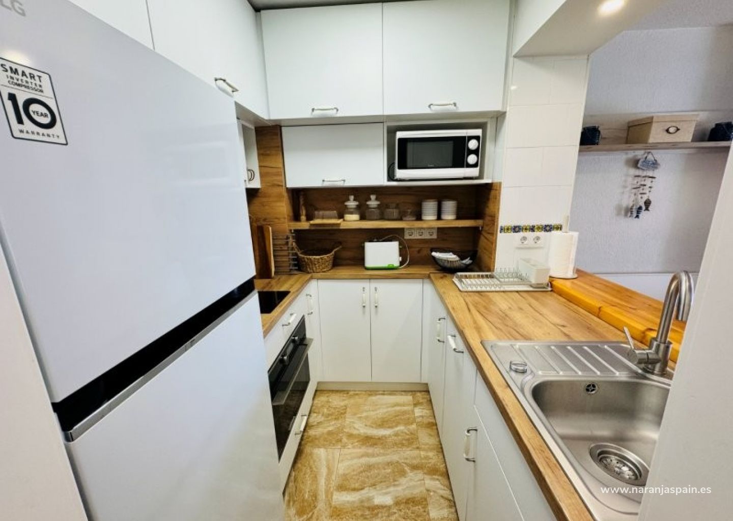 This beachfront apartment boasts a south-facing terrace with sea views. Located in a quiet residential area, it's ideal for living or vacationing. It's situated in the Puerto Romano urbanization in La Mata. The apartment offers approximately 56 square meters of living space, comprising a living/dining room, open-plan kitchen, two bedrooms, a full bathroom, a terrace, and an interior patio. The apartment is located on the ground floor of the building. Renovated and in perfect condition. Tourist License Community fees: €320 per year Property tax (IBI): €175