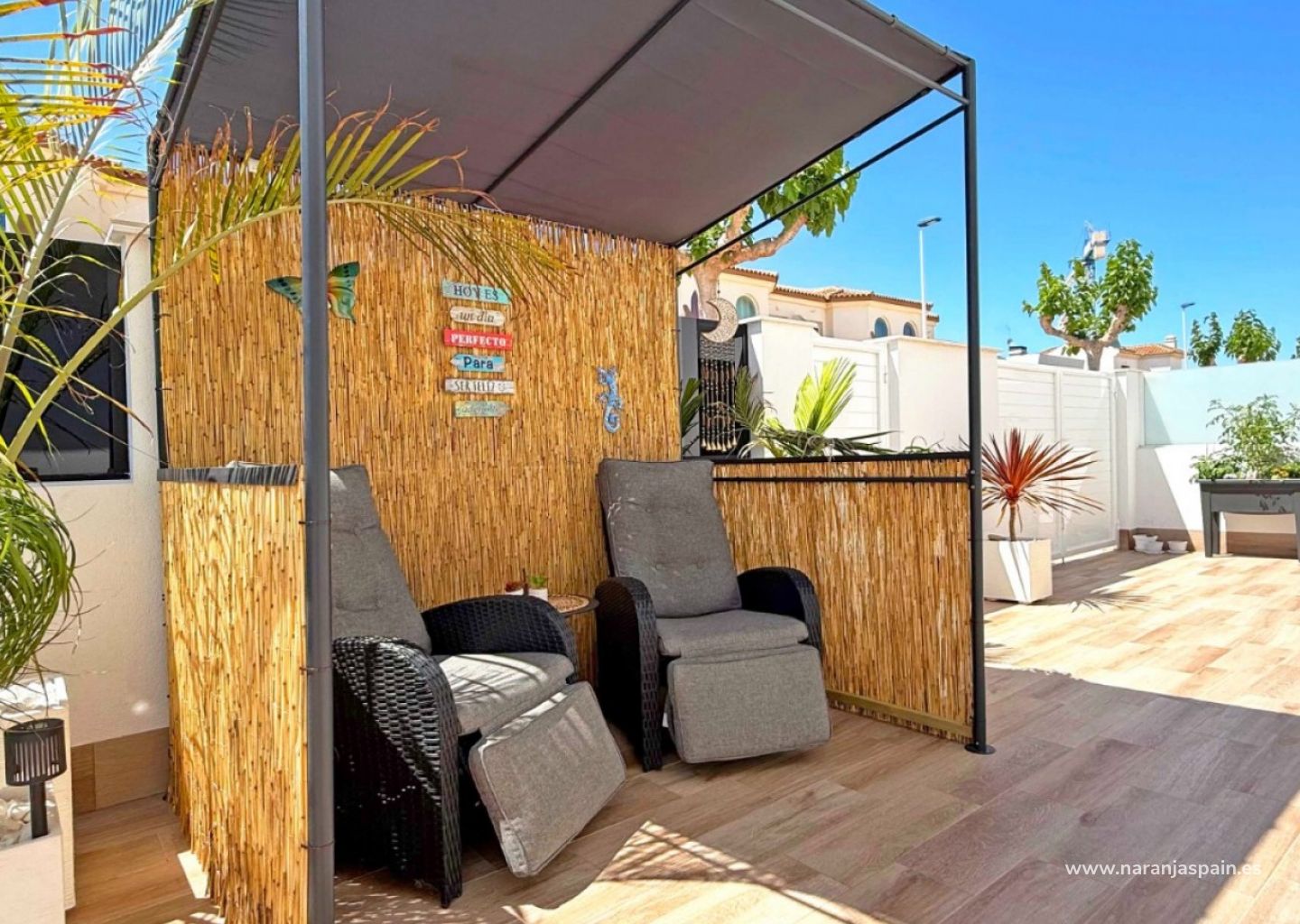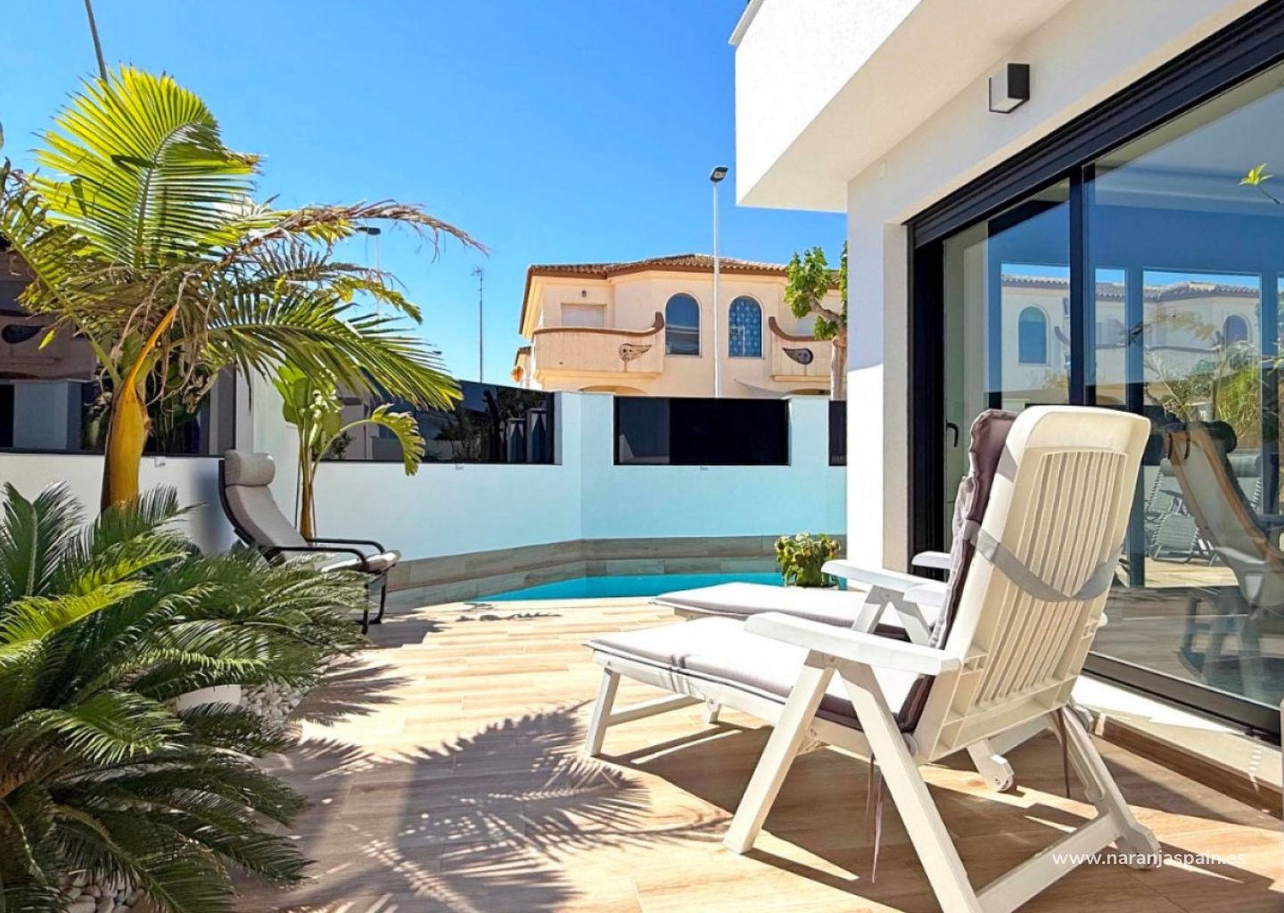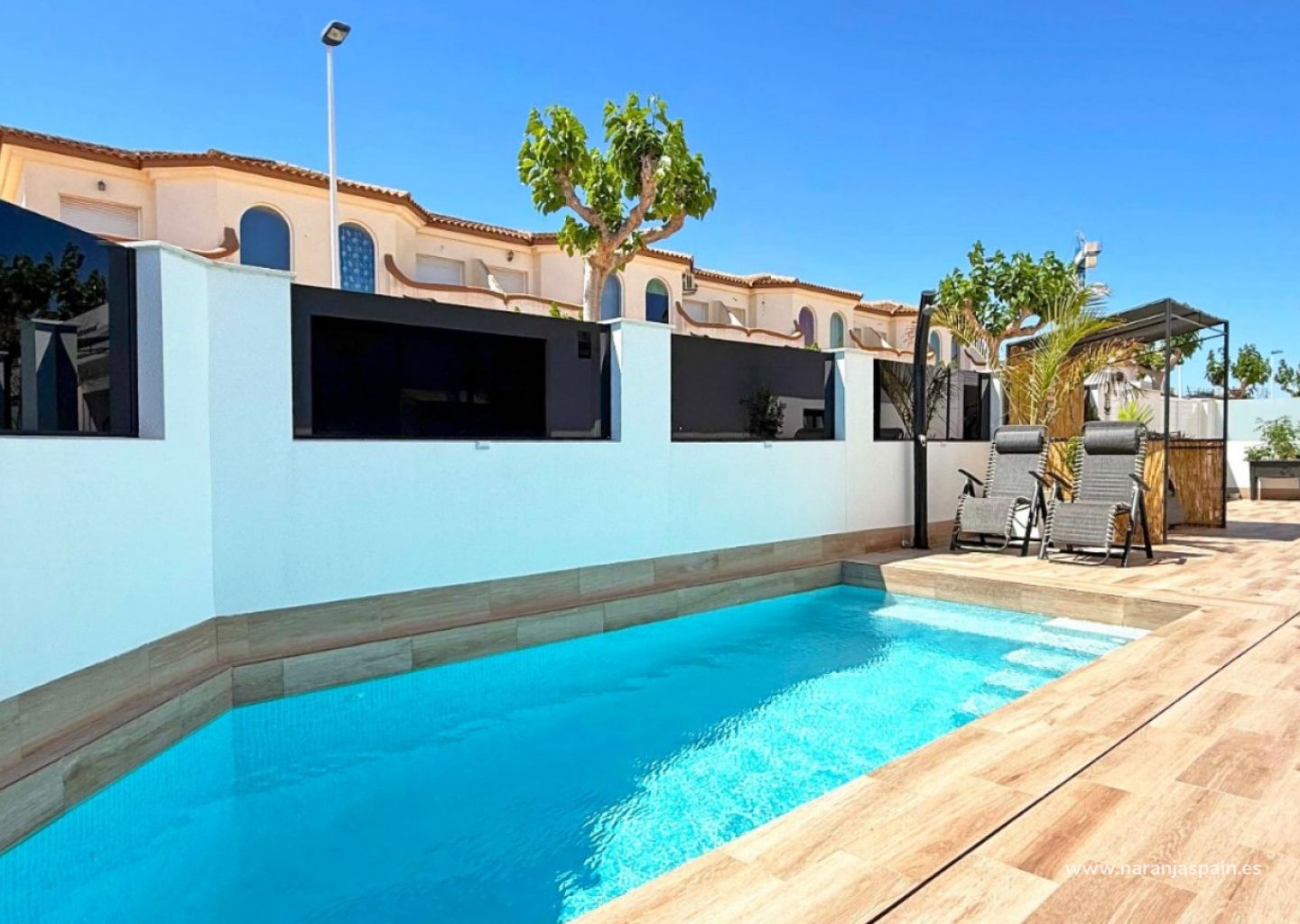 Step into contemporary comfort with this stylish, south-facing detached villa, built in 2024 and presented in as-new condition. Located in the heart of San Pedro del Pinatar, this two-bedroom, two-bathroom home stands out with high-end finishes and thoughtful extras throughout.