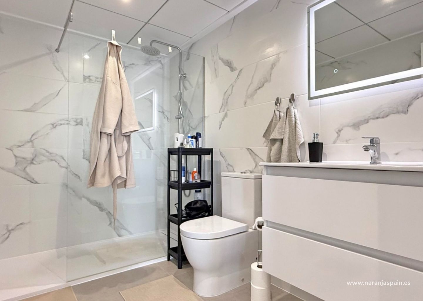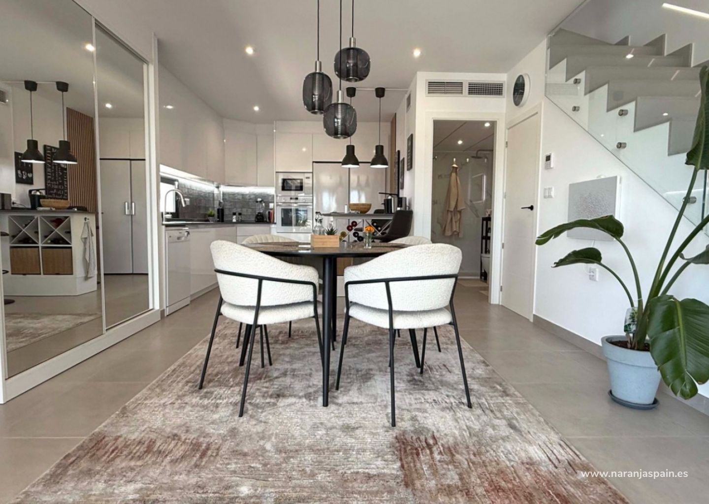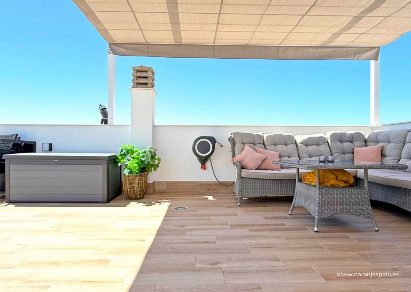 The villa boasts a bright and extended living room with direct access to the sun-drenched outdoor areas. A private balcony and a spacious roof terrace with a fully equipped outdoor kitchen, lighting, and a sleek pergola offer the perfect setting for entertaining or relaxing in the Spanish sun.