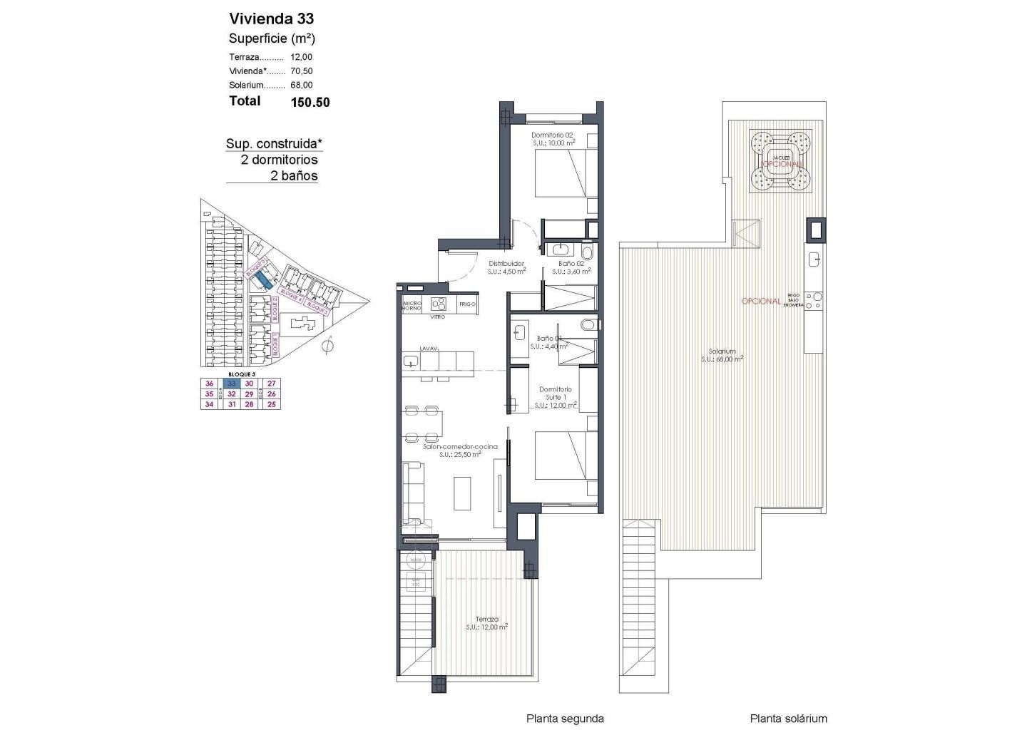 New Build Resort Apartments at La Serena Golf-Los Alcazares Near the Beach Modern Golf Front Living on the Costa Calida Discover this exclusive new build residential resort located at La Serena Golf in Los Alcazares. This contemporary development features 66 stylish apartments with 2 or 3 bedrooms and 2 bathrooms, one of them en suite, designed to offer comfort, elegance and an exceptional Mediterranean lifestyle just 300 meters from the Mar Menor. Los Alcazares is a charming coastal town known for its relaxed atmosphere, sandy beaches and long seaside promenade. With more than 300 days of sunshine per year, the area offers a perfect environment for outdoor living, water sports and golf. The town also provides a wide selection of restaurants, shops, marinas and sports facilities, making it a highly desirable destination for both permanent residence and holiday homes. Apartments with Terraces, Gardens and Private Solariums The residential complex offers several property types to suit different lifestyles. Buyers can choose between ground floor apartments with private gardens, middle floor homes with spacious terraces or penthouses with terraces and large rooftop solariums. The solariums include an outdoor shower and offer the option to add a summer kitchen and private jacuzzi, creating an ideal space for relaxation and entertaining while enjoying open views of the golf course and surrounding landscape. Each home has been designed with bright interiors and open plan living spaces that connect seamlessly with the outdoor areas. Resort Style Amenities and Exceptional Communal Areas One of the most distinctive features of this development is its resort style concept. Residents can enjoy a spectacular lagoon style swimming pool of approximately 190 m2 with beach style access and relaxing areas with Balinese beds. Additional communal facilities include landscaped gardens, a spa area, gym and sauna located in the basement level. The complex also offers a children playground, two petanque courts and communal restrooms near the pool area, creating a welcoming environment for residents and guests. Quality Finishes and Modern Features The apartments are built with modern materials and high quality specifications designed for comfort and style. Fully equipped kitchen with white glass finish appliances Bathrooms with vanity units, shower screens and backlit mirrors Motorized window shutters Basic lighting package Fully installed ducted air conditioning Underground parking space for each property Underground bicycle parking and optional storage rooms Prime Location Close to Beach and Golf Mar Menor beach 0.3 km La Serena Golf next to the development Los Alcazares town center 2 km Cartagena 22 km Murcia 40 km Region de Murcia International Airport 30 km Alicante Elche Airport 90 km The calm and shallow waters of the Mar Menor are ideal for swimming, sailing and paddle surfing throughout the year. Secure Your Home at La Serena Golf Resort These modern apartments combine beachside living, golf views from most units and resort style amenities in one of the most attractive areas of the Costa Calida. Contact us today to receive more information or arrange a visit and secure your new home in La Serena Golf-Los Alcazares.