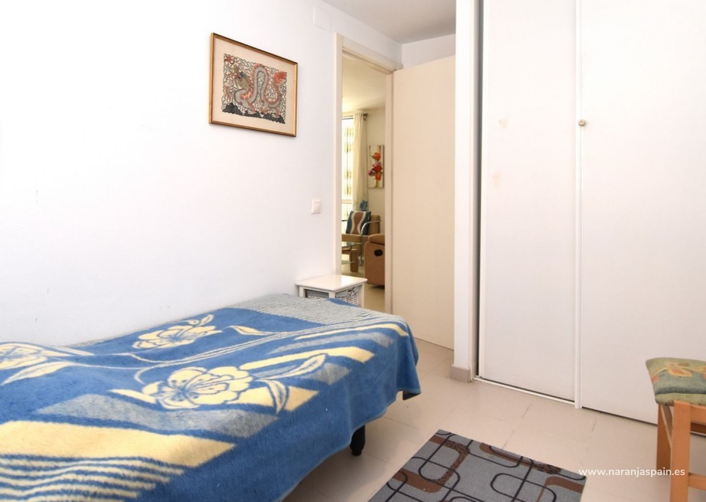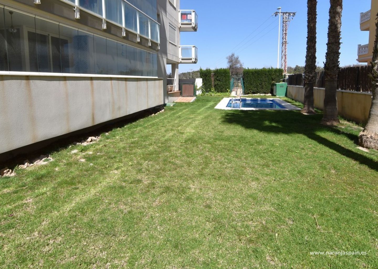 The apartment is accessed directly from the ground floor. Upon entering, you are welcomed by a bright and spacious interior. To the left is the bathroom, featuring a large walk-in shower. Next to it is the master bedroom, which includes generous built-in wardrobes and sliding doors that open onto the terrace. The living room offers a comfortable lounge and dining area, also with direct access to the terrace. From here, you can enjoy views of the green area and the communal swimming pool.