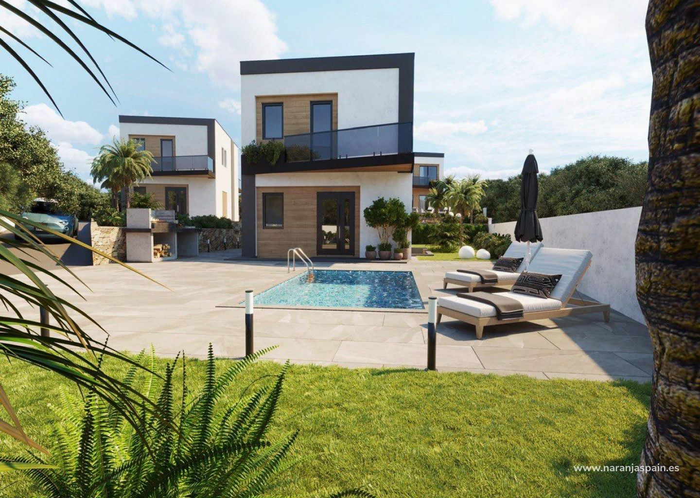 Modern New Build Villas in Finestrat with Private Pool Near Benidorm Prime Location in Finestrat-Costa Blanca Discover this exclusive development of just 5 contemporary villas located in Finestrat, one of the most desirable residential areas on the Costa Blanca. Perfectly positioned between the charming village of Finestrat and the vibrant city of Benidorm, these homes offer a peaceful environment surrounded by nature while remaining close to all amenities. The area is known for its stunning views of the Mediterranean Sea and surrounding mountains, as well as its proximity to golf courses, shopping centers and leisure facilities. Finestrat combines traditional Spanish charm with modern infrastructure, making it ideal for both permanent living and holiday homes. Its elevated position ensures open views and a sense of privacy, while the coast is just a short drive away. Contemporary Villas Designed for Comfort and Style These elegant villas feature a modern minimalist design with clean lines, large panoramic windows and spacious private terraces. Each property is distributed over two floors and offers 3 bedrooms and 3 bathrooms, including a master bedroom with a walk in wardrobe and access to a private terrace. An additional dressing room provides extra convenience and storage. The open plan layout enhances natural light and creates a seamless connection between indoor and outdoor living spaces, perfect for enjoying the Mediterranean lifestyle all year round. Private Outdoor Spaces and Premium Features Each villa sits on a landscaped private plot and includes a private swimming pool, ideal for relaxing and entertaining. The properties also offer private parking for two vehicles within the plot. High quality finishes and modern installations ensure maximum comfort and energy efficiency. Features include aerothermal hot water systems, split air conditioning units with individual control in each room, and designer interior and exterior lighting. The kitchen comes fully furnished and equipped with ceramic hob, extractor hood and oven. Energy Efficient Homes with Modern Technology Built with premium materials and holding an energy rating A, these villas are designed to reduce energy consumption while maintaining a high level of comfort. The combination of insulation, efficient systems and quality construction ensures a sustainable and cost effective home. Excellent Connectivity and Nearby Points of Interest Benidorm beaches 5 km Finestrat village 3 km Puig Campana Golf 2 km La Marina Shopping Center 4 km Port of Benidorm 6 km Alicante Airport 55 km Your Ideal Mediterranean Home Awaits Whether you are looking for a stylish permanent residence, a holiday retreat or a smart investment, these modern villas in Finestrat offer location, quality and lifestyle in one package. Contact us today to receive more information or to arrange a viewing and secure your new home on the Costa Blanca.