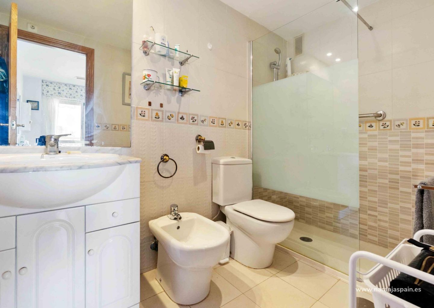 91m2 bute yra trys miegamieji, du vonios kambariai (vienas vonios kambarys), atskira, įrengta virtuvė, svetainė-valgomasis ir apie 15m2 terasa. A/C svetainėje. Parduodamas su dalinai baldais.