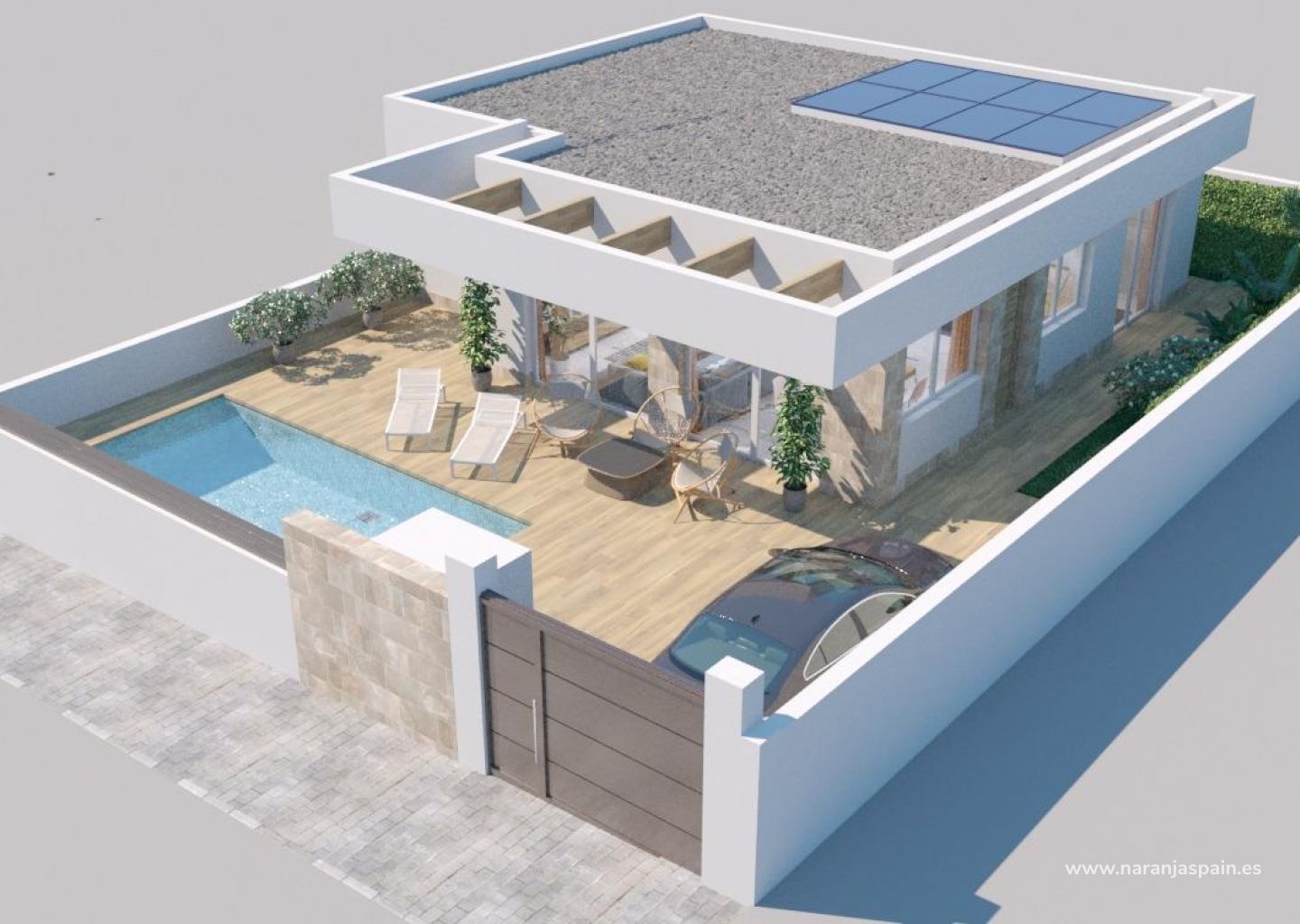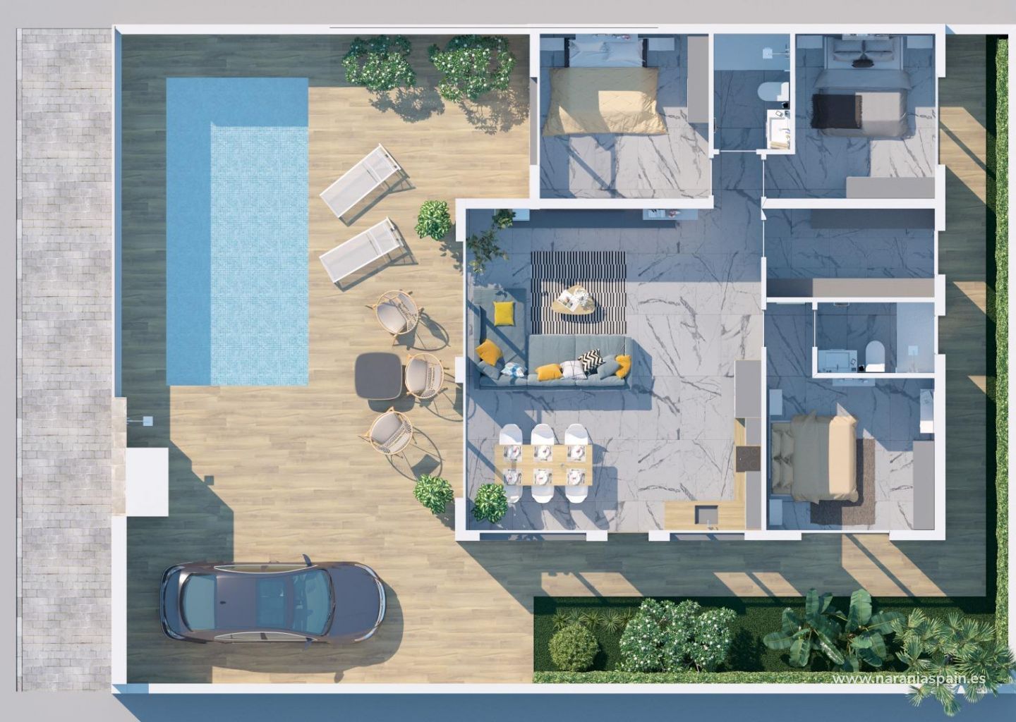 Vila yra 275 m² sklype ir turi 229,10 m² gyvenamojo ploto, paskirstytą per 3 miegamuosius ir 2 vonios kambarius. 3x6 m baseinas ir terasos su vaizdu į sodą ir baseino zoną leidžia mėgautis Kosta Blankos saule ir klimatu ištisus metus. Viloje taip pat yra soliariumas ir daug vietos automobiliams.