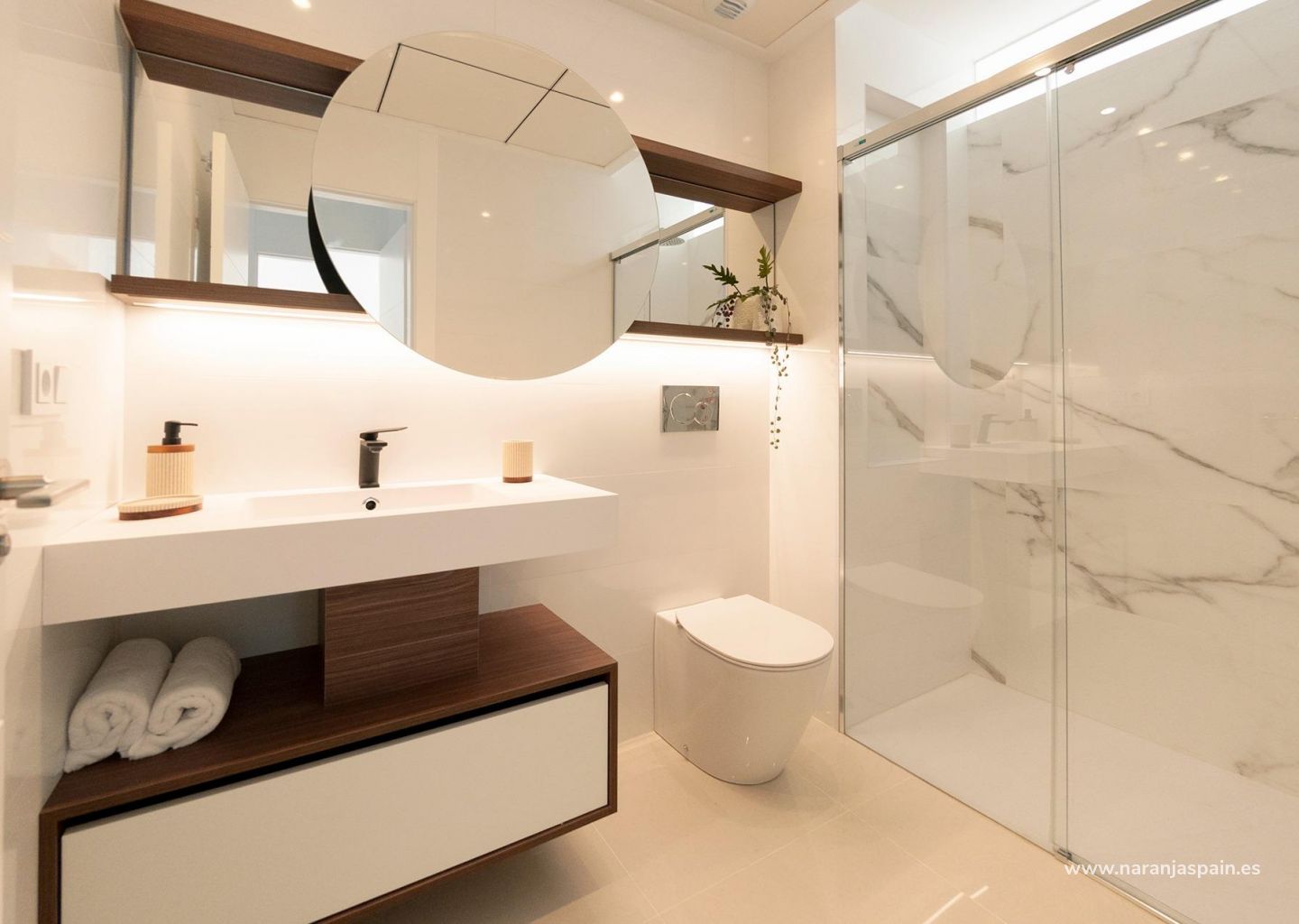 Modernios dviejų aukštų dvibučių vilos su 3 miegamaisiais, 2 arba 3 vonios kambariais, atviro plano virtuve ir svetaine, įmontuotomis spintomis, terasomis, privačiu sodu ir soliariumu.