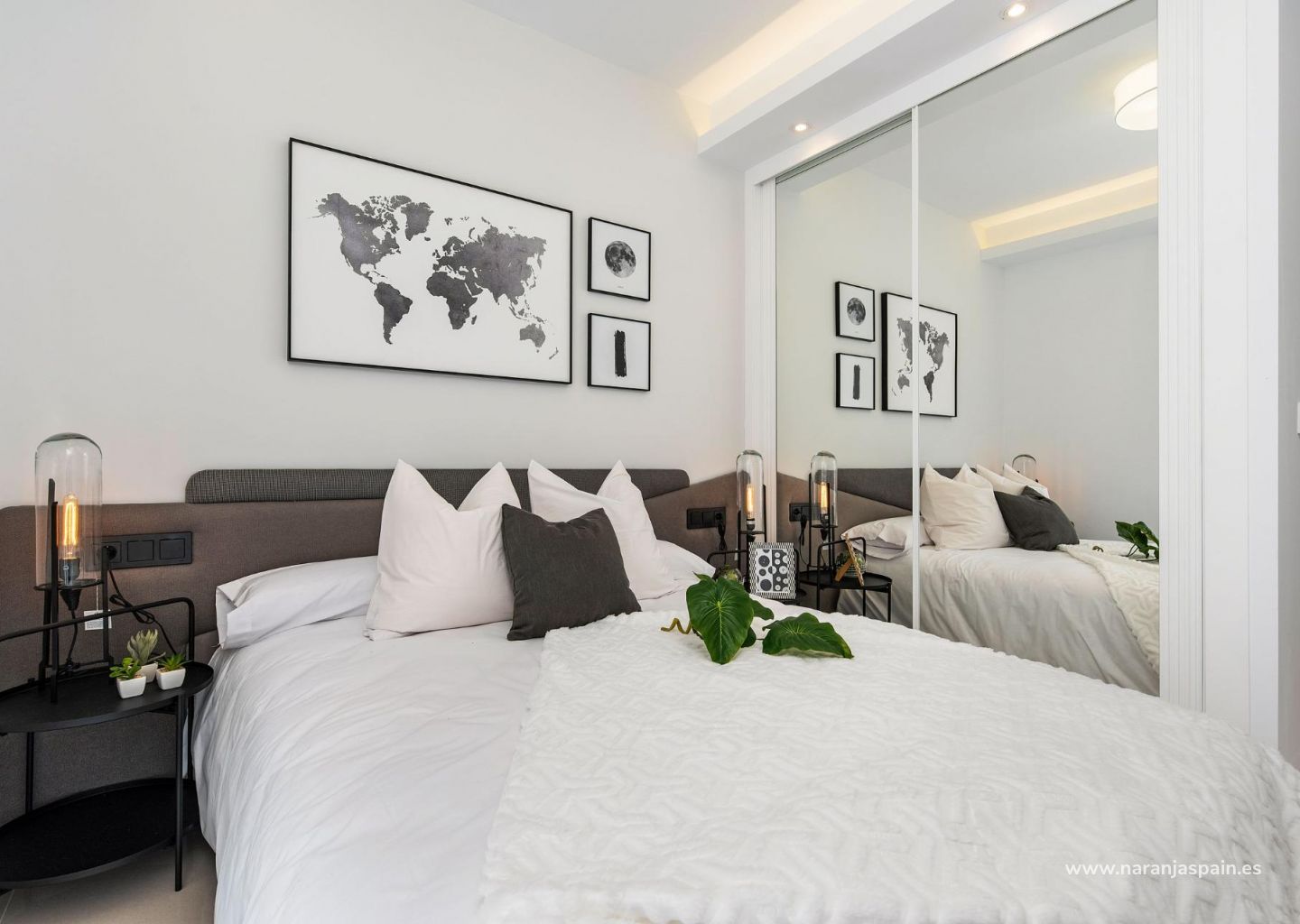Modernios dviejų aukštų dvibučių vilos su 3 miegamaisiais, 2 arba 3 vonios kambariais, atviro plano virtuve ir svetaine, įmontuotomis spintomis, terasomis, privačiu sodu ir soliariumu.