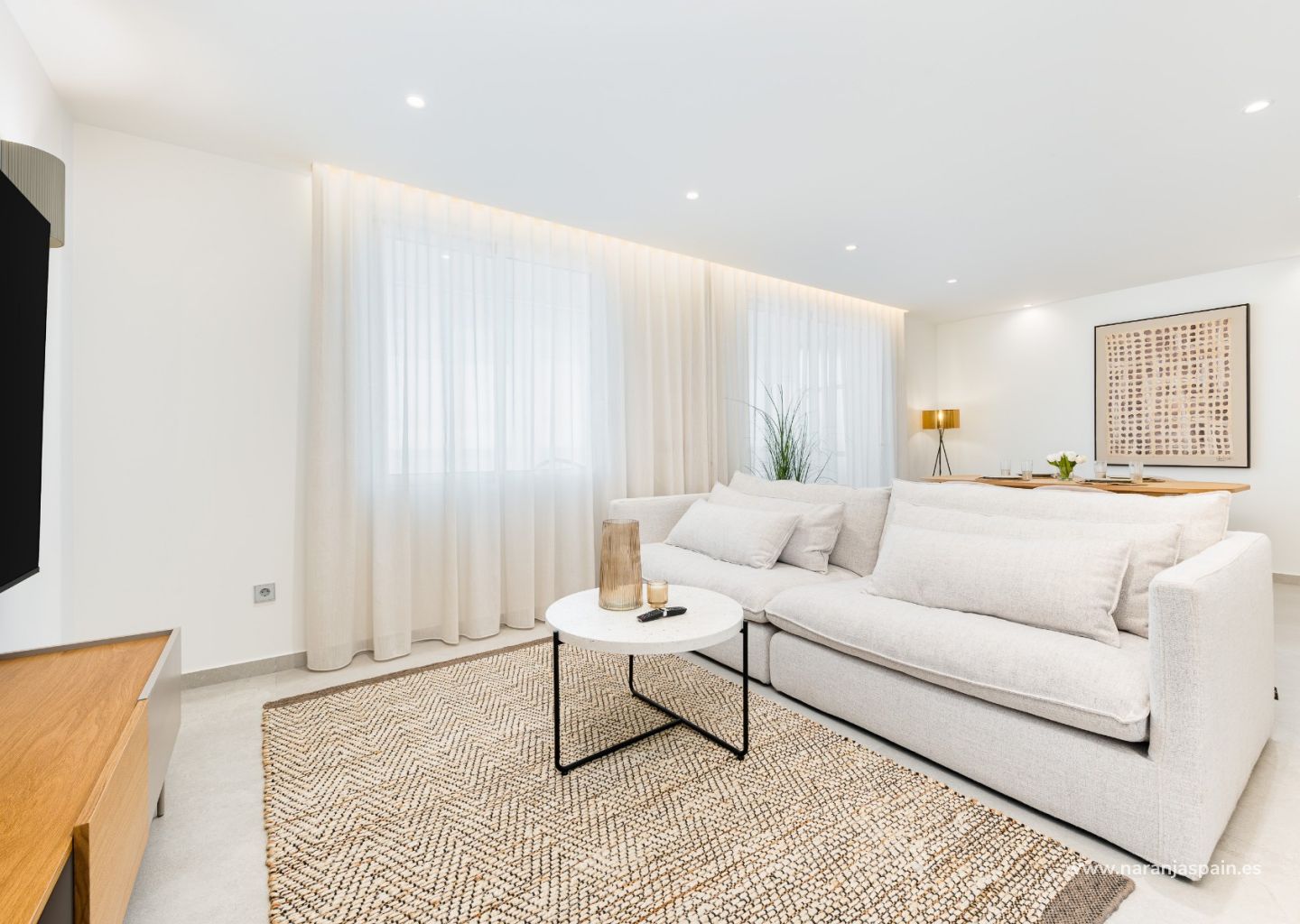 Šviesi svetainė harmoningai susijungia su modernia, visiškai įrengta virtuve, sukurdama elegantišką ir jaukią atmosferą.
