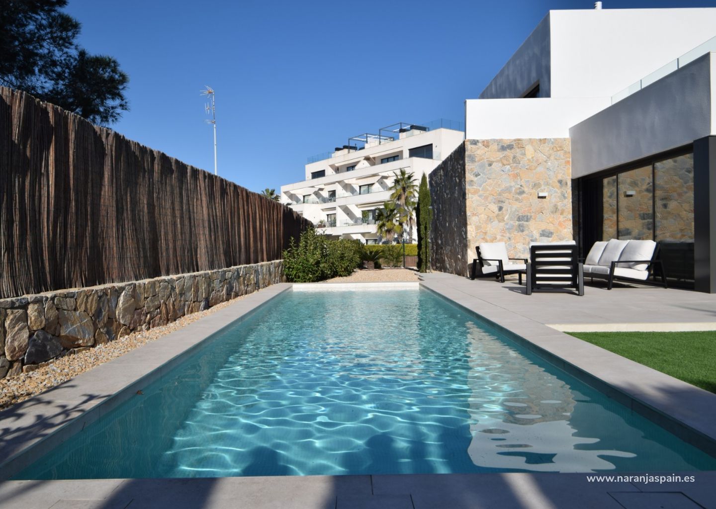Atviro plano svetainės ir valgomojo erdvė sklandžiai pereina į didelį, apželdintą sodą, kuris puikiai tinka tiek poilsiui, tiek svečių priėmimui visiškoje ramybėje. Privatus baseinas, apsuptas vešlios žalumos ir apgalvotai suplanuotų lauko zonų, leidžia mėgautis Viduržemio jūros saule ištisus metus.