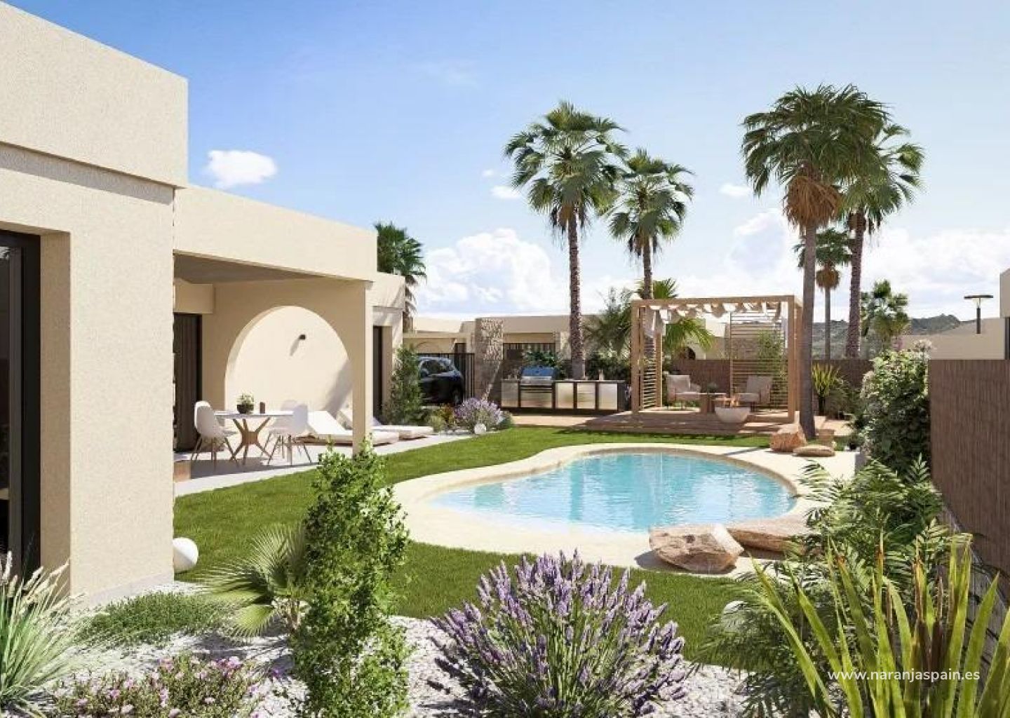 Šios elegantiškos vilos yra suprojektuotos viename aukšte, siekiant maksimalaus komforto ir funkcionalumo. Pirkėjai gali rinktis iš 2, 3 arba 4 miegamųjų ir 2 arba 3 vonios kambarių bei svečių tualeto. Kiekviename name yra atvira virtuvė ir svetainė, kuri sklandžiai jungiasi su lauko terasa ir privačiu kraštovaizdžio sodu su baseinu. Sklype yra privati automobilių stovėjimo vieta, užtikrinanti patogumą ir privatumą.