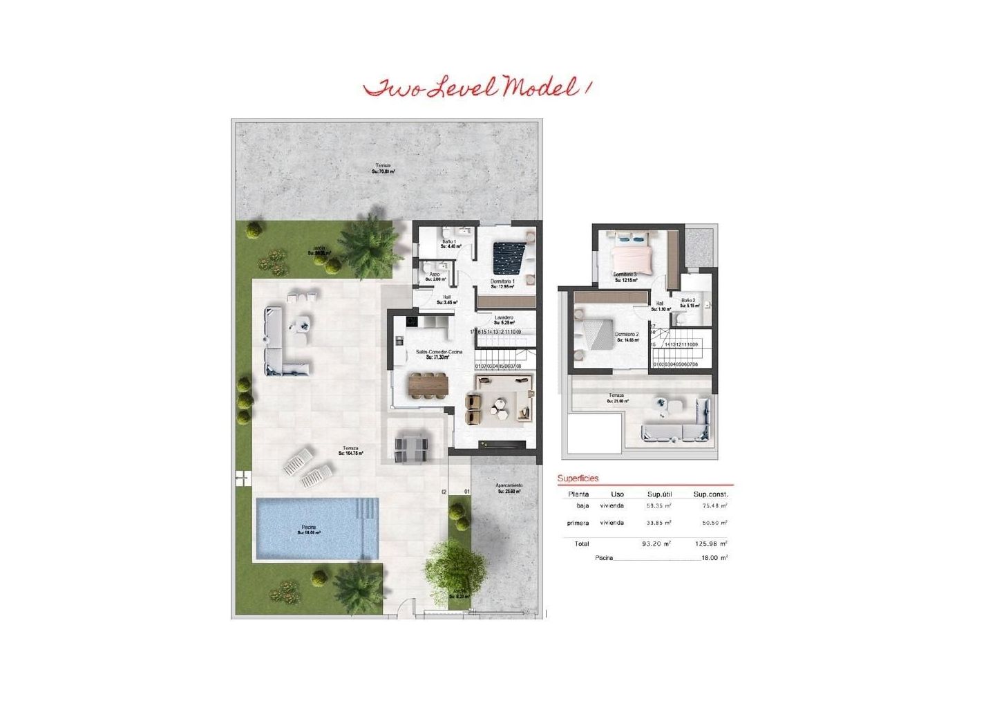 Naujos statybos vilos „Altaona Golf Resort“ kurorte Mursijoje su privačiu baseinu ir vaizdu į kalnus Šiuolaikiškos vilos „Altaona Golf Resort“ kurorte Mursijoje Atraskite išskirtinį naujų modernių vilų projektą, įsikūrusį „Altaona Golf Resort“ kurorte – vienoje iš patraukliausių gyvenamųjų vietovių Mursijoje. Apsuptas gamtos peizažų ir kalnų, šis saugus golfo kurortas siūlo ramią aplinką, tuo pačiu esant vos kelios minutės kelio automobiliu nuo Mursijos miesto ir Viduržemio jūros pakrantės. Šios naujos statybos vilos suprojektuotos taip, kad užtikrintų komfortą, privatumą ir atsipalaidavusį Viduržemio jūros regiono gyvenimo būdą. Komplekse siūlomas vieno aukšto vilų pasirinkimas su pasirinktiniu soliariumu arba dviejų aukštų išplanavimu; visose vilose yra trys miegamieji ir dvi vonios, įskaitant pagrindinį miegamąjį su privačia vonios kambariu. Erdvus dizainas su privačiais sodais ir baseinu Kiekviena vila pastatyta privačiame sklype, kurio plotas prasideda nuo 300 m², siūlančiame daug lauko erdvės, kad galėtumėte mėgautis saulės spinduliais ištisus metus. Nekilnojamasis turtas apima privatų baseiną, sutvarkytus sodo plotus ir automobilių stovėjimo vietą sklype. Interjero išplanavimas sukurtas taip, kad maksimaliai išnaudotų natūralią šviesą ir sukurti sklandų ryšį tarp gyvenimo viduje ir lauke. Atviro plano svetainė ir valgomasis tiesiogiai jungiasi su terasa ir baseinu, sukuriant puikias sąlygas atsipalaiduoti ar pramogauti su šeima ir draugais. Aukštos kokybės apdaila ir modernios funkcijos Šios vilos pastatytos naudojant aukštos kokybės medžiagas ir modernias statybos technologijas, siekiant užtikrinti komfortą ir energijos efektyvumą. Įranga apima sustiprintas saugumo įėjimo duris, pilnai įrengtą virtuvę su buitine technika, grindų šildymą vonios kambariuose ir vidaus LED apšvietimo paketą. Papildomos specifikacijos apima paruoštą instaliaciją kanaliniam oro kondicionavimui ir karšto vandens gamybai naudojant energiją taupančią aeroterminę sistemą, užtikrinančią tiek tvarumą, tiek išlaidų taupymą. Puiki vieta netoli golfo, miesto ir pakrantės „Altaona Golf Resort“ kurortas žinomas dėl savo 18 duobučių golfo aikštyno, ramios aplinkos ir puikios apsaugos, todėl jis idealiai tinka tiek nuolatiniam gyvenimui, tiek atostogų namams. Kurortas siūlo unikalią gamtos, sporto ir artumo prie pagrindinių lankytinų vietų derinį. Mursijos miesto centras yra vos už 15 km ir siūlo platų parduotuvių, restoranų, kultūrinių pramogų bei paslaugų pasirinkimą. Mar Menor ir Viduržemio jūros pakrantės paplūdimiai yra maždaug už 20 km – tai puiki vieta mėgautis saulėtomis dienomis prie jūros. Kiti svarbūs atstumai: Mursijos-Korveros oro uostas – 15 km, Kartachenos miestas – 35 km, o keletas golfo aikštynų yra vos už kelių minučių kelio automobiliu, todėl ši vieta idealiai tinka golfo mėgėjams ir tarptautiniams pirkėjams. Puiki investicija ir galimybė gyventi Viduržemio jūros regiono stiliumi Šios naujos vilos „Altaona Golf Resort“ kurorte suteikia puikią galimybę mėgautis aukštos kokybės gyvenimo būdu natūralioje ir saugioje aplinkoje, iš kurios lengvai pasiekiamas tiek miestas, tiek pakrantė. Susisiekite su mumis šiandien, jei norite gauti daugiau informacijos arba susitarti dėl apžiūros ir atrasti savo naujus namus Mursijoje.
