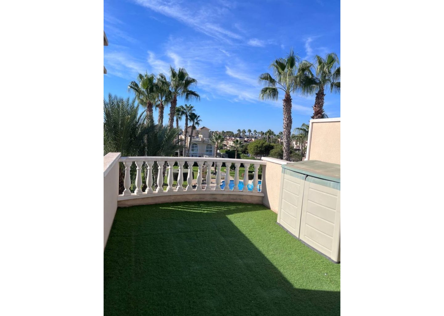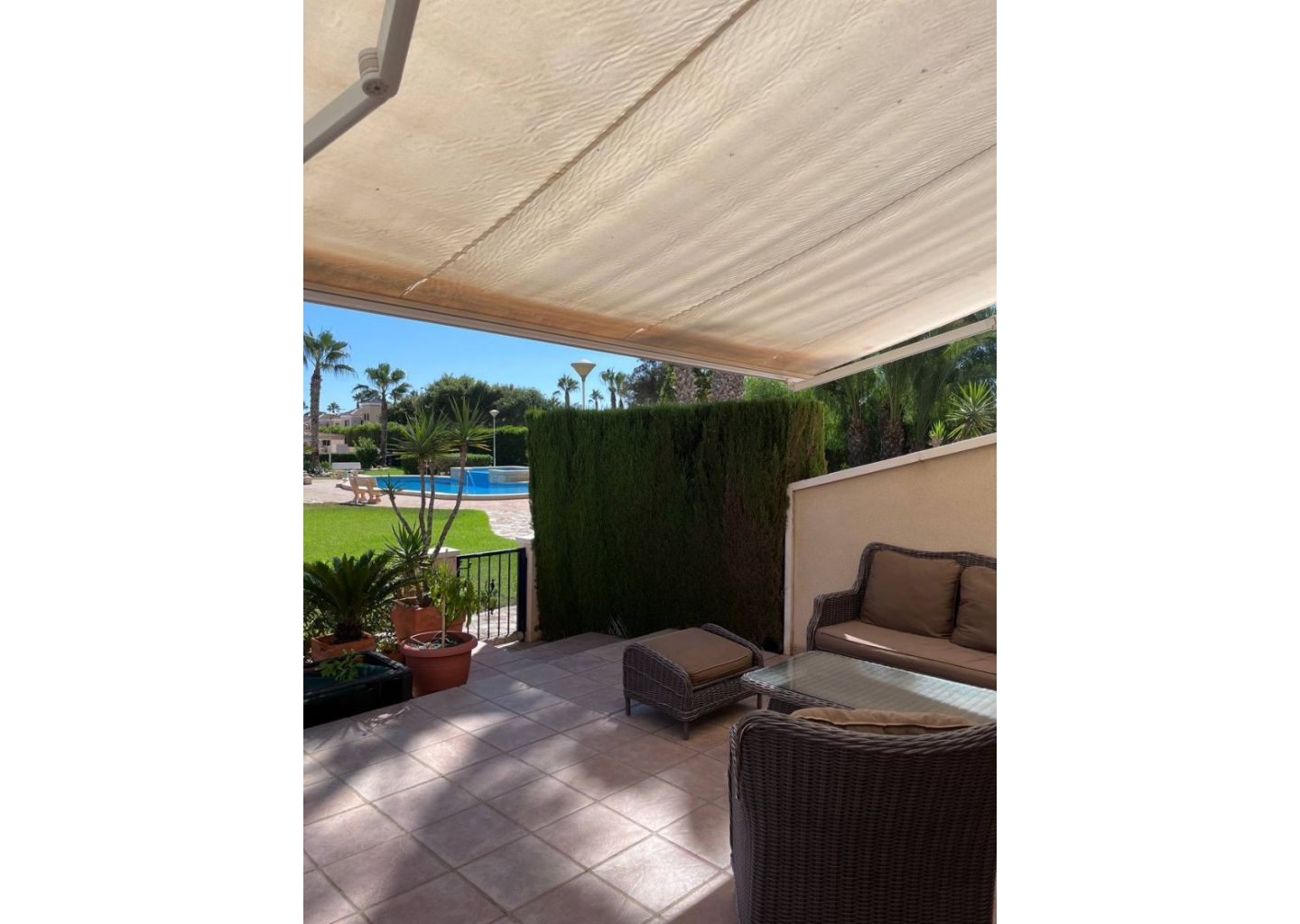 Išorėje yra didelis privatus sklypas su automobilių stovėjimo vieta ir kepsninės zona, puikiai tinkanti mėgautis Viduržemio jūros gyvenimo būdu. Turtas priklauso prižiūrimai gyvenamajai bendruomenei su bendromis žaliosiomis erdvėmis ir baseinu.