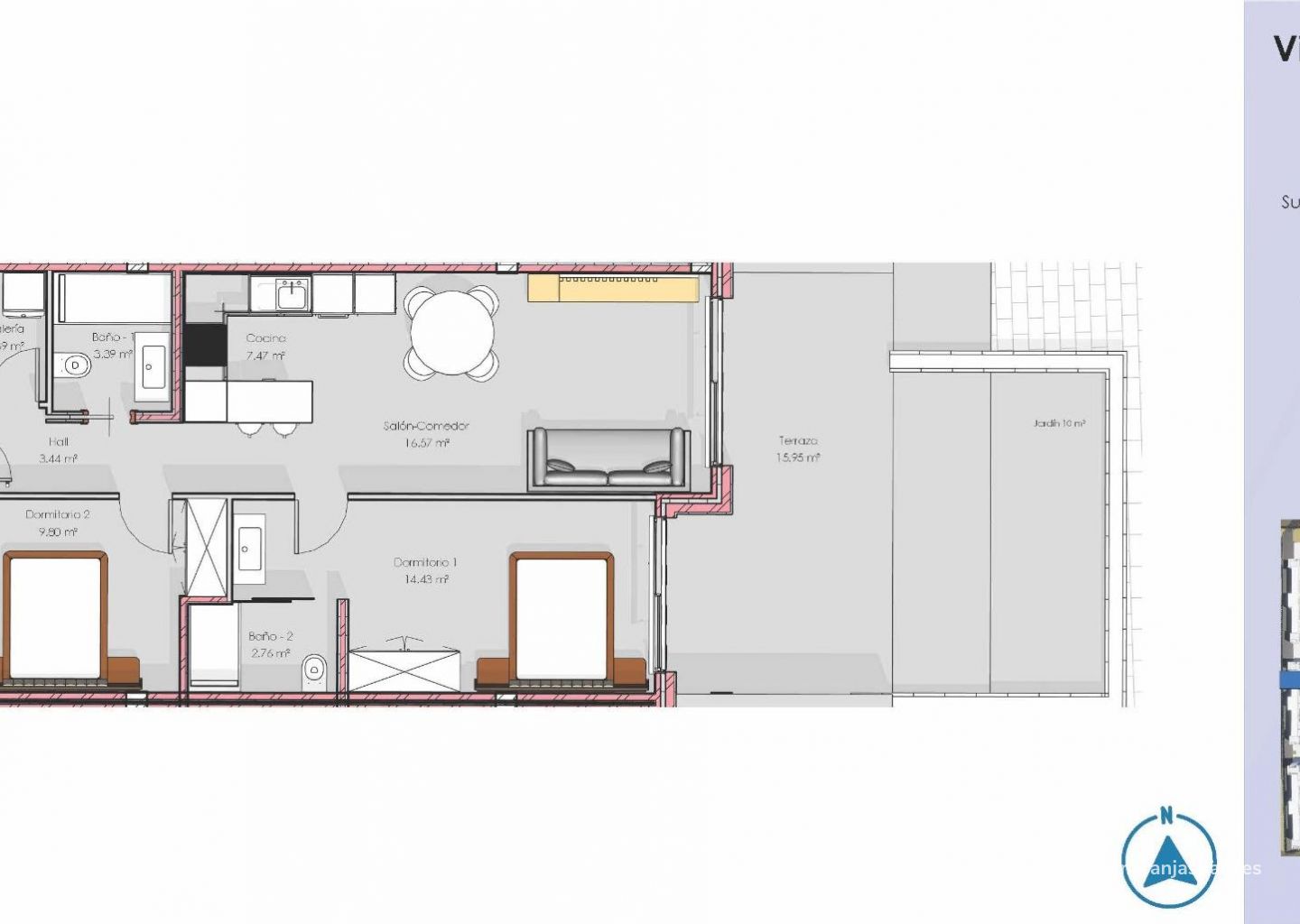 Šiuolaikiški, įrengti butai El Raso-Guardamar rajone – modernus gyvenimas netoli paplūdimio ir golfo aikščių Išskirtinis gyvenamųjų namų kompleksas Guardamar del Segura mieste Atraskite šį išskirtinį naujos statybos projektą, kurį sudaro 120 stilingų butų, esančių El Raso, labai populiariame Guardamar del Segura rajone, esančiame Costa Blanca. Apsuptas gamtos peizažų ir netoli Viduržemio jūros pakrantės, šis gyvenamasis kompleksas siūlo puikų ramybės ir prieinamumo balansą. El Raso yra žinomas dėl savo ramios aplinkos, tuo pačiu esantis vos kelių minučių atstumu nuo gyvybingo miesto centro, smėlėtų paplūdimių ir plataus paslaugų pasirinkimo, įskaitant restoranus, parduotuves ir laisvalaikio įrenginius. Šiuolaikiniai namai, suprojektuoti siekiant komforto ir stiliaus Komplekse siūlomi 2 ir 3 miegamųjų apartamentai su įvairiais išplanavimais, pritaikytais kiekvienam gyvenimo būdui. Galite rinktis iš pirmame aukšte esančių butų su privačiais sodais, viduriniuose aukštuose esančių apartamentų su erdvėmis terasomis arba penthausų su privačiais soliariumais, idealiai tinkamais mėgautis Viduržemio jūros klimatu ištisus metus. Visi namai yra visiškai įrengti ir paruošti apsigyventi, įskaitant pilnai įrengtas virtuves su buitine technika bei pilnai įrengtas vonios kambarius su baldais, veidrodžiais ir dušo pertvaromis. Kiekvienam butui taip pat priklauso požeminė automobilių stovėjimo vieta ir sandėliukas, užtikrinantys patogumą ir praktiškumą nuo pat pirmos dienos. Aukštos kokybės įranga ir energiją taupantis gyvenimas Šie modernūs namai pastatyti atsižvelgiant į smulkmenas ir suprojektuoti siekiant maksimalaus komforto. Įranga apima kanalinius oro kondicionierius, elektrines žaliuzes ir visą apšvietimo paketą. Kokybiškų medžiagų ir išmanaus dizaino derinys sukuria šviesias ir funkcionalias gyvenamąsias erdves, kurios pagerina kasdienį gyvenimą, tuo pačiu užtikrinant energijos taupymą. Išskirtinės bendrosios erdvės ir gyvenimo kokybę gerinančios paslaugos Gyvenamasis kompleksas siūlo platų aukščiausios kokybės bendrųjų patalpų pasirinkimą, skirtą poilsiui ir gerovei. Gyventojai gali mėgautis dideliu baseinu, apsuptu kraštovaizdžio sodais, visiškai įrengta sporto sale, vidaus SPA, petankos aikštele ir vaikų žaidimų aikštele. Kiekviena detalė buvo kruopščiai apgalvota, siekiant sukurti bendruomenę, kurioje susilieja komfortas, laisvalaikis ir socialinis gyvenimas. Puiki vieta su puikiu susisiekimu El Raso yra strategiškai įsikūręs netoli pagrindinių lankytinų vietų: Guardamar miesto centras 4 km Moncayo paplūdimys 5 km Ciudad Quesada 5 km Torrevieja ir „Habaneras“ prekybos centras 8 km „La Marquesa“ golfo klubas 6 km „La Finca“ golfo klubas 12 km „Vistabella Golf“ – 18 km Alicantės oro uostas – 30 km Mursijos Corveros oro uostas – 75 km Jūsų idealus namas arba investicija „Costa Blanca“ Nesvarbu, ar ieškote nuolatinės gyvenamosios vietos, atostogų namų, ar protingos investicijos galimybės, šie visiškai įrengti butai Guardamar del Segura mieste siūlo išskirtinę vertę puikioje vietoje prie jūros. Susisiekite su mumis šiandien, kad gautumėte daugiau informacijos arba susitartumėte dėl apžiūros ir užsitikrintumėte savo naujus namus „Costa Blanca“.