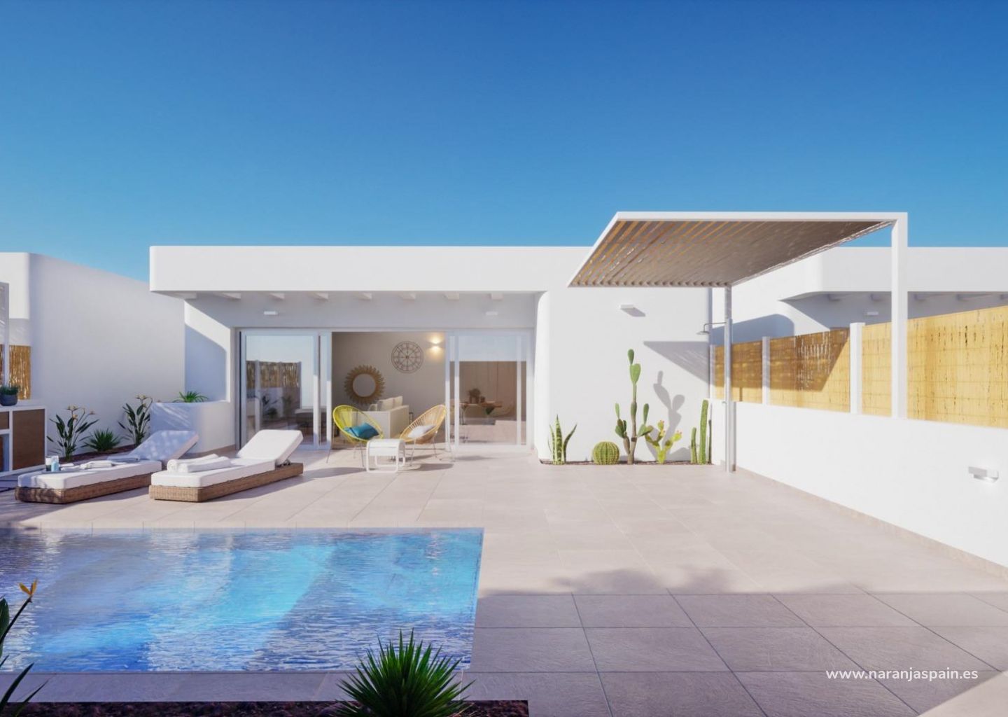 Nybyggede villaer i Ibiza-stil på uavhengige tomter med terrasse, parkeringsplass og privat basseng. Huset har stue, kjøkken, 3 soverom, 2 bad og har privilegert utsikt.