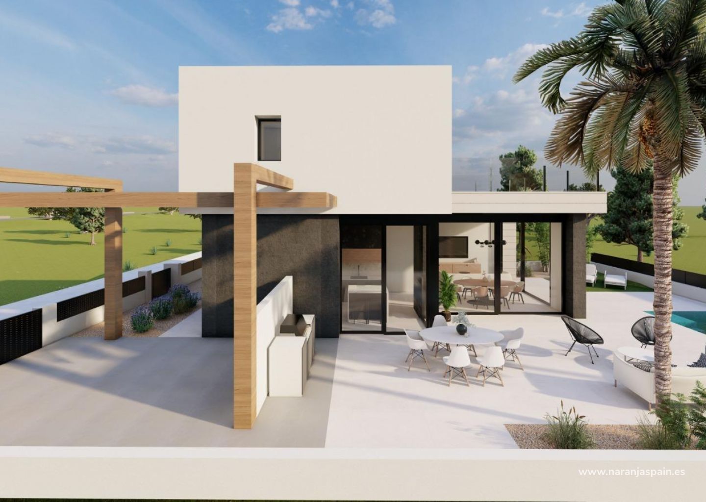 Nybygde villaer bygget over 2 etasjer, har 3 soverom, 2 bad, gjestetoalett, åpen kjøkkenløsning med stue, garderober, privat hage med basseng og parkeringsplass utenfor veien.