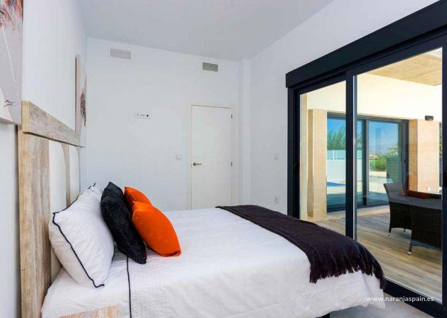 Villa med 3 soverom med innebygde garderober og 2 bad og med 18 m2 terrasse. Spisestuen har direkte tilgang til det private bassenget og uteområdene.