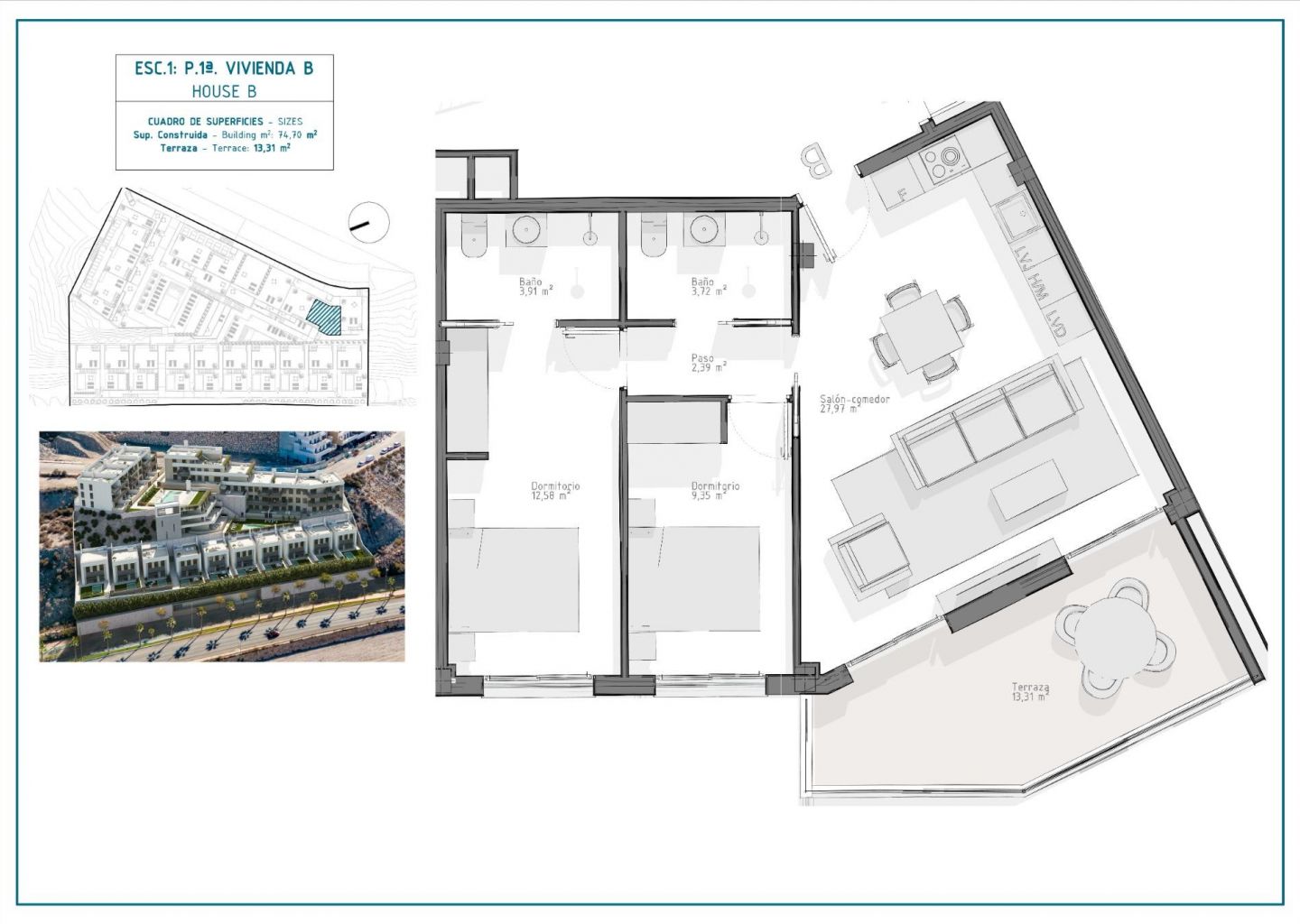 Nybyggkomplekset består av 36 leiligheter med 3 og 2 soverom fordelt på 4 moderne blokker, utstyrt med 2 felles svømmebassenger og felles garasje med parkeringsplass og bod for hver eiendom; og 10 elegante villaer med 4 soverom og 3 bad, alle med eget privat basseng.