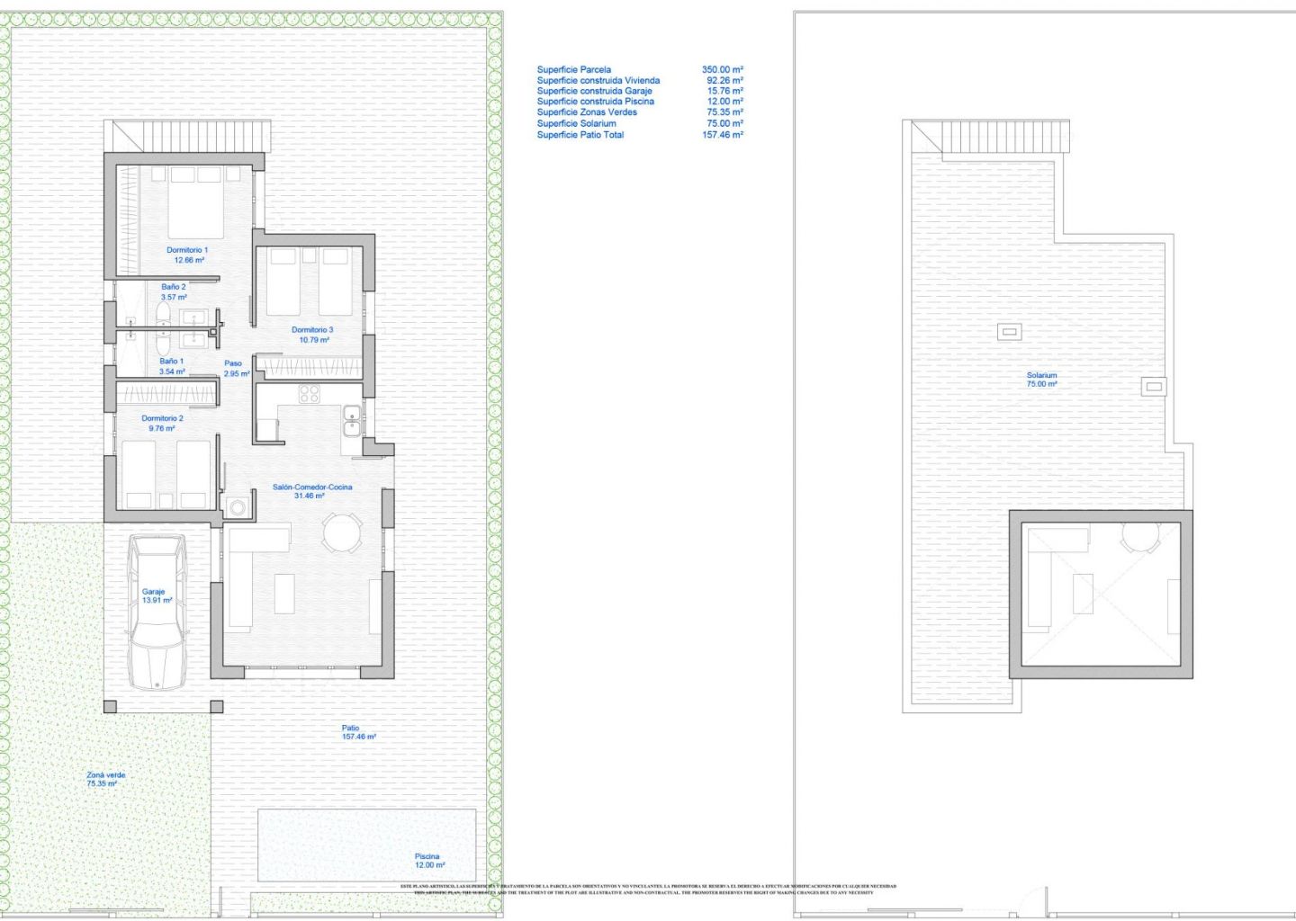 Villa med 3 soverom og 2 bad, åpen kjøkkenløsning med stue, garderober, solarium, privat hage med parkeringsplass og plass til svømmebasseng.