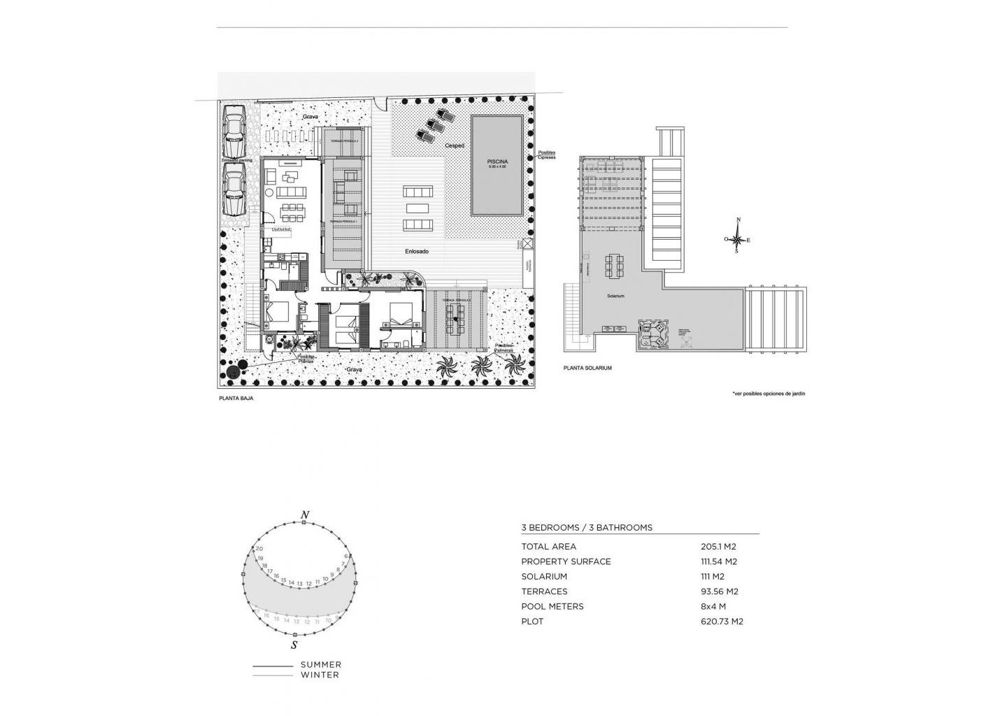 Villaen har stue-spisestue med åpen kjøkkenløsning, 3 soverom og 3 bad, stort solarium, privat hage, svømmebasseng og parkeringsplass.