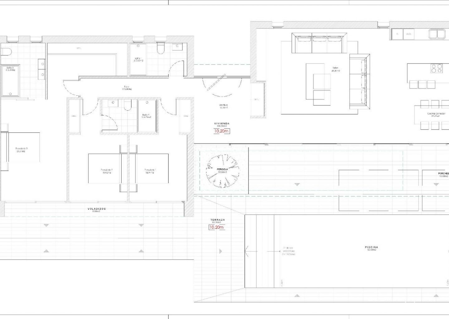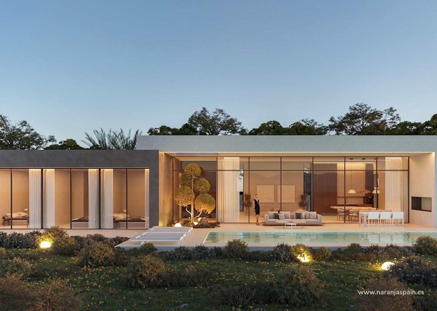 På høyre side av huset er soveområdet, med 3 soverom: hovedsuiten med omkledningsrom og bad og ytterligere to soverom som deler bad.