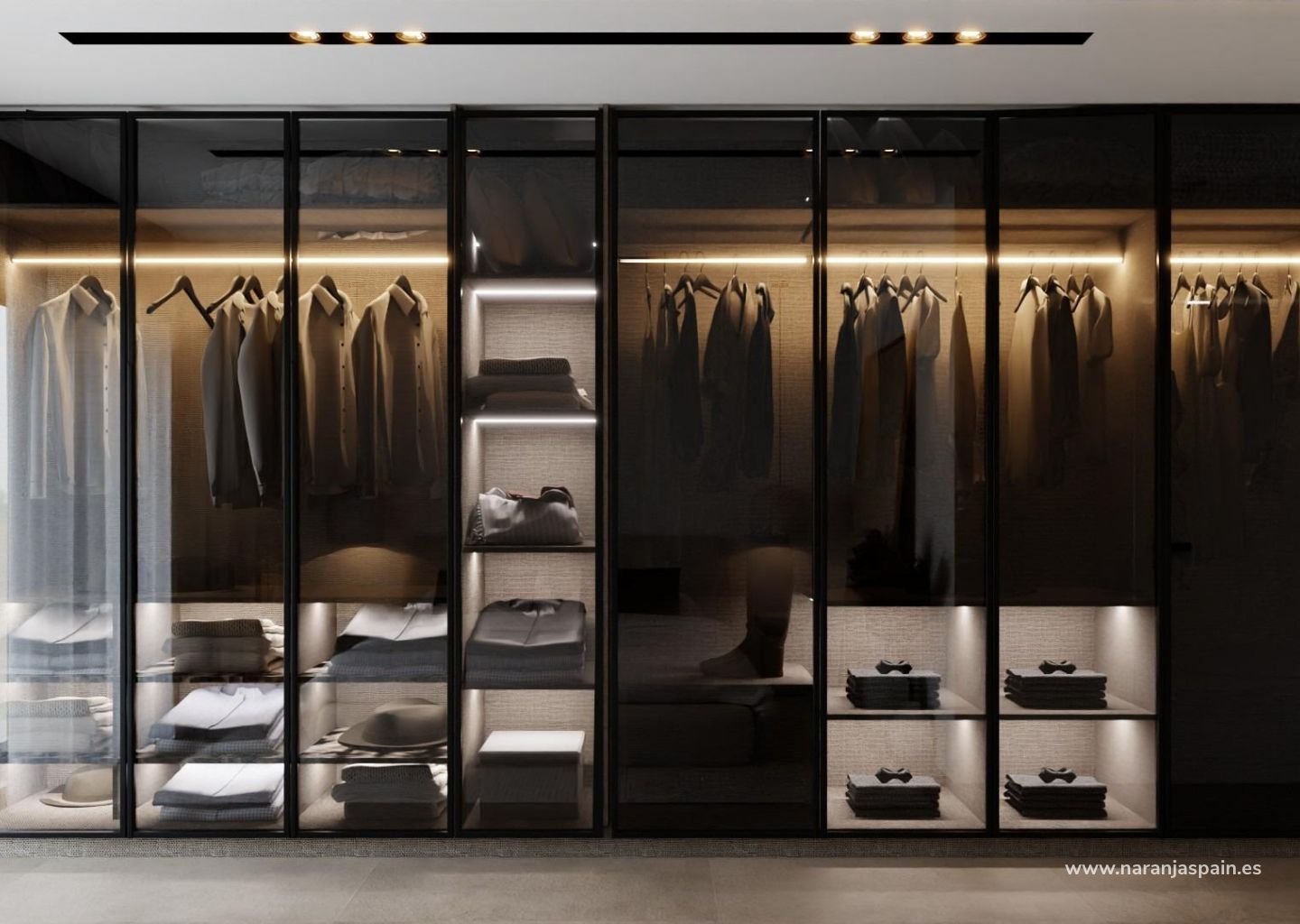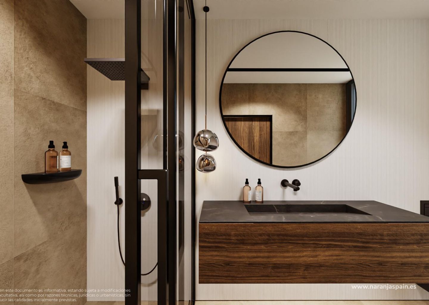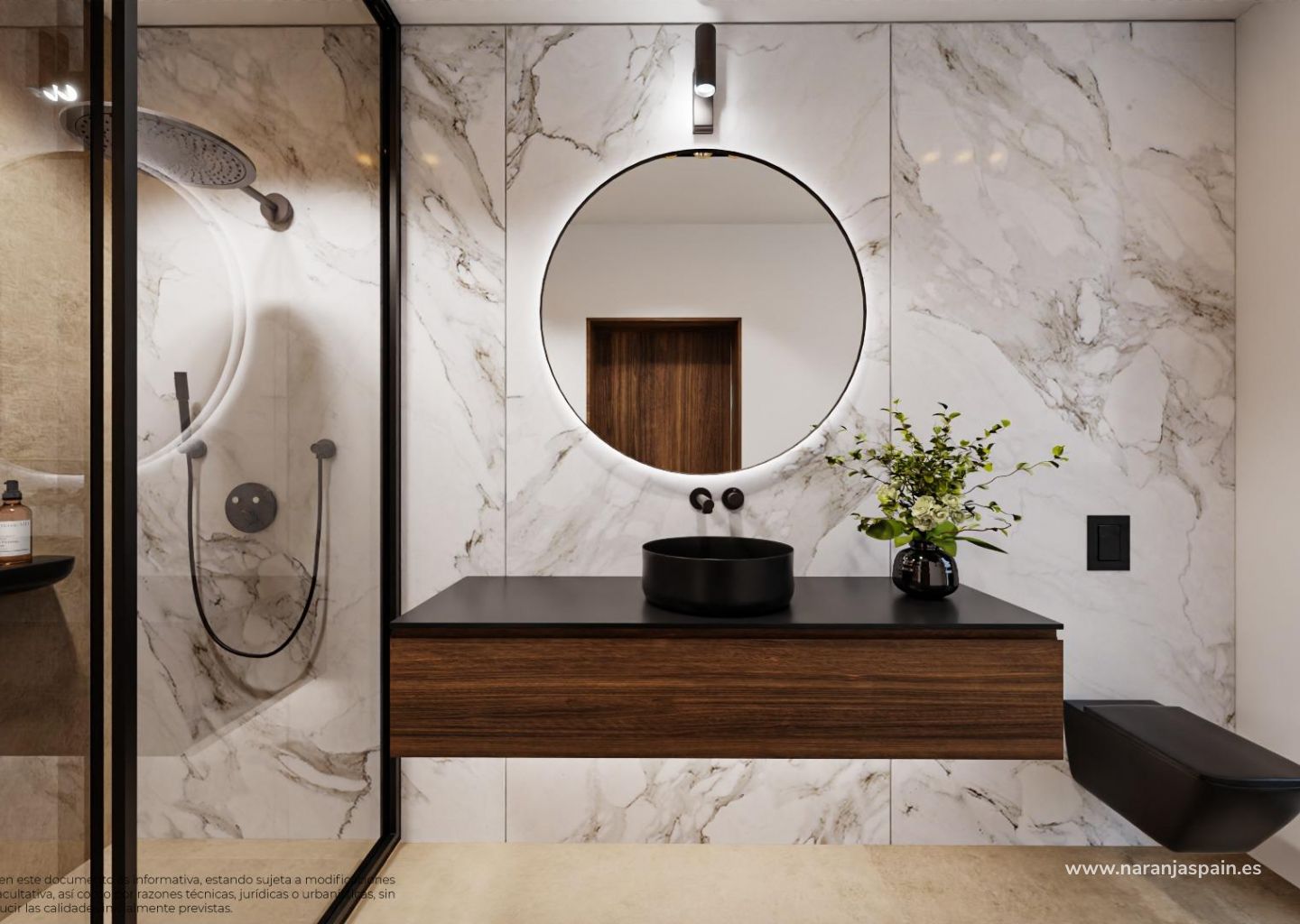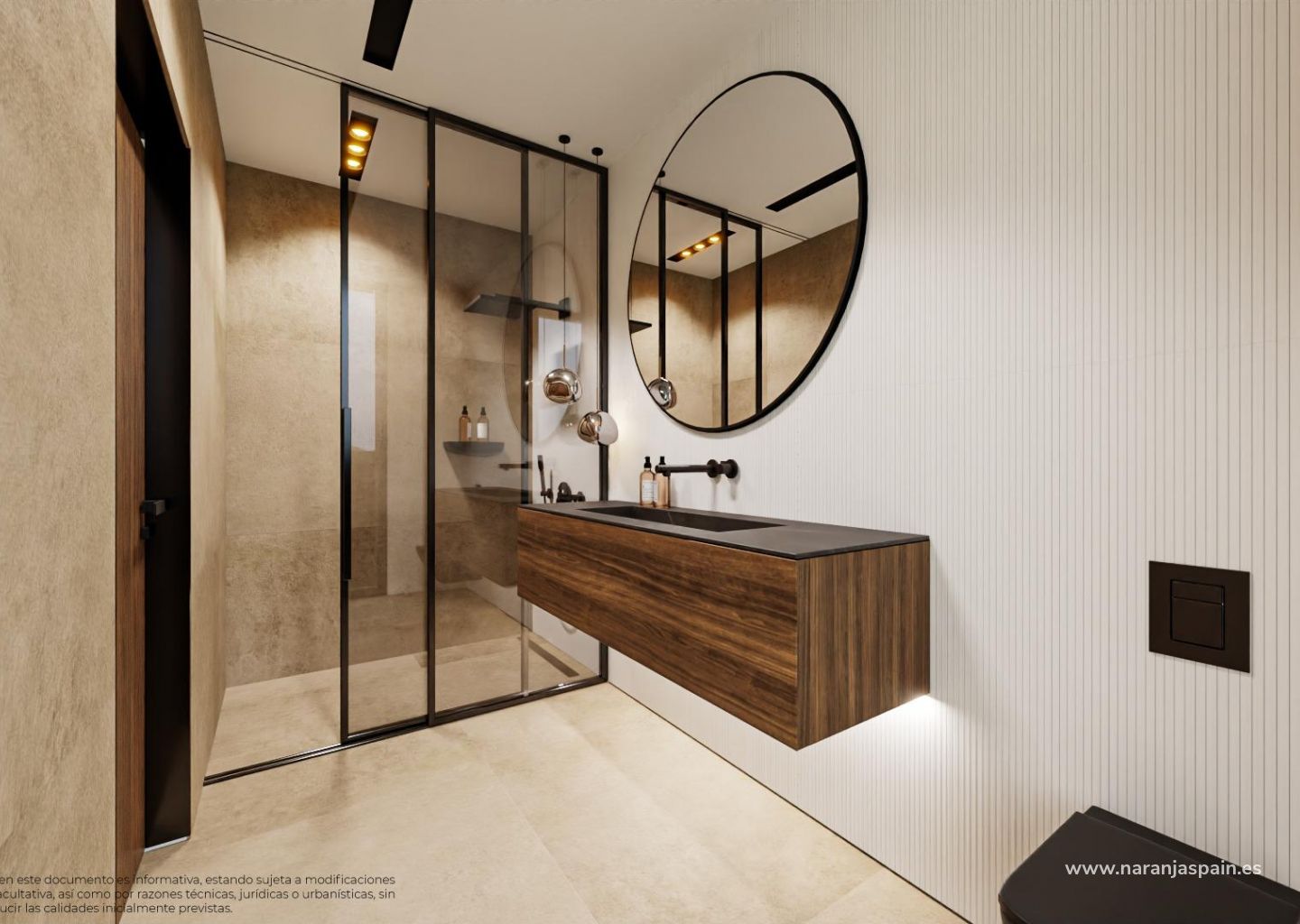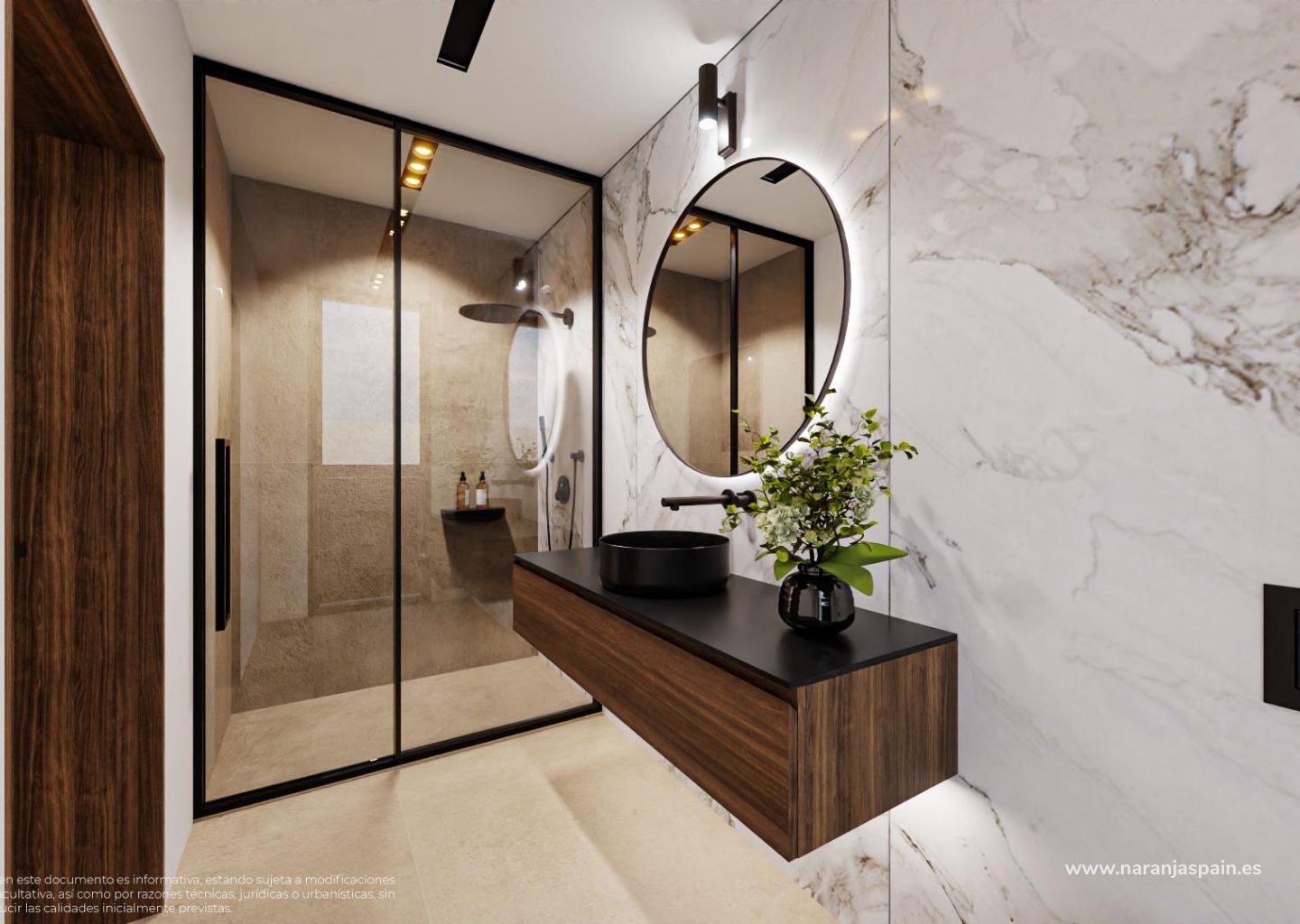 Designerbad med LED-belysning, hengende servanter og dusjvegger i sikkerhetsglass