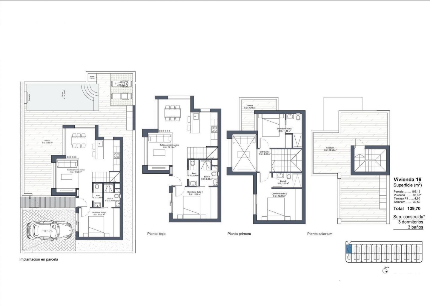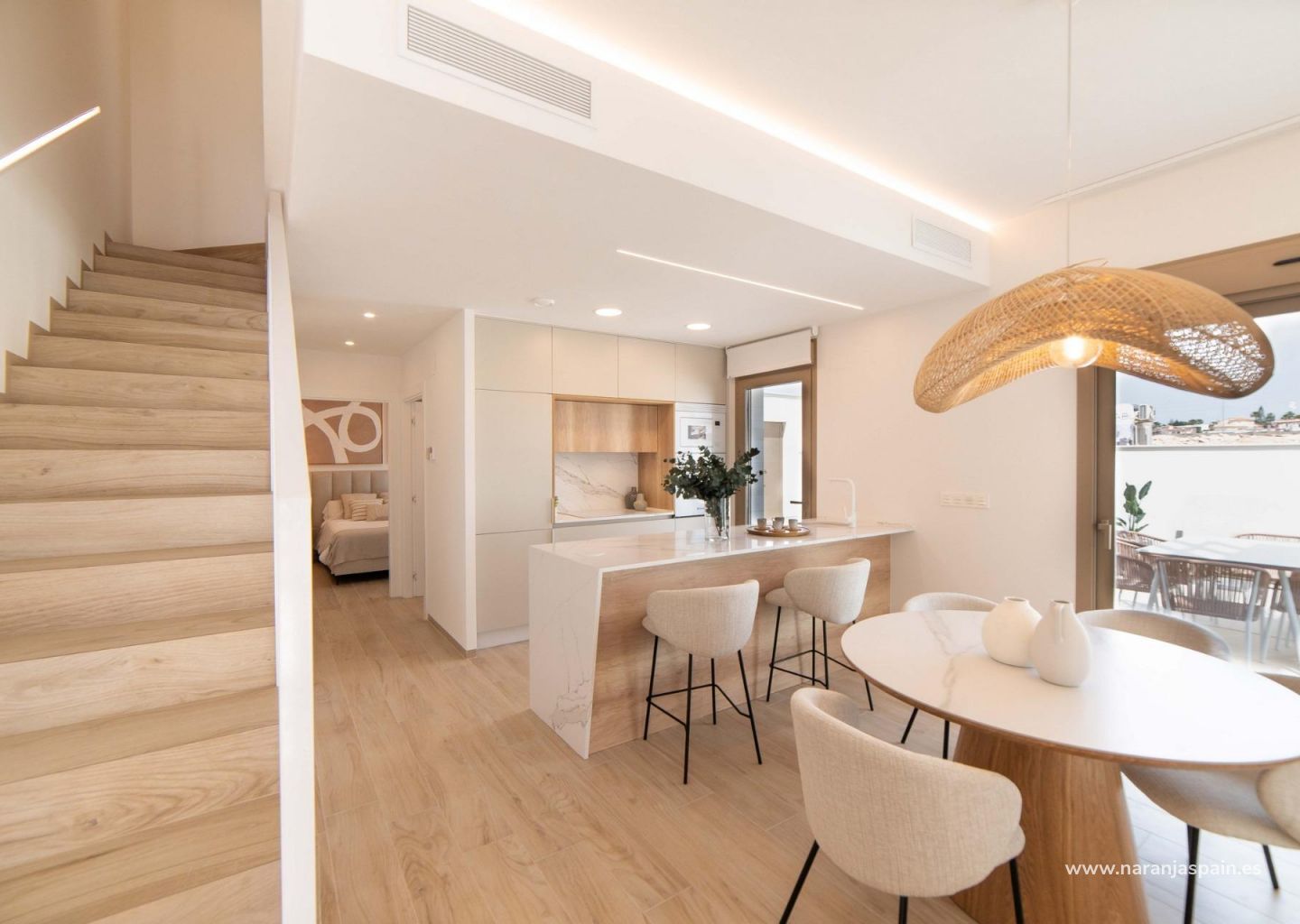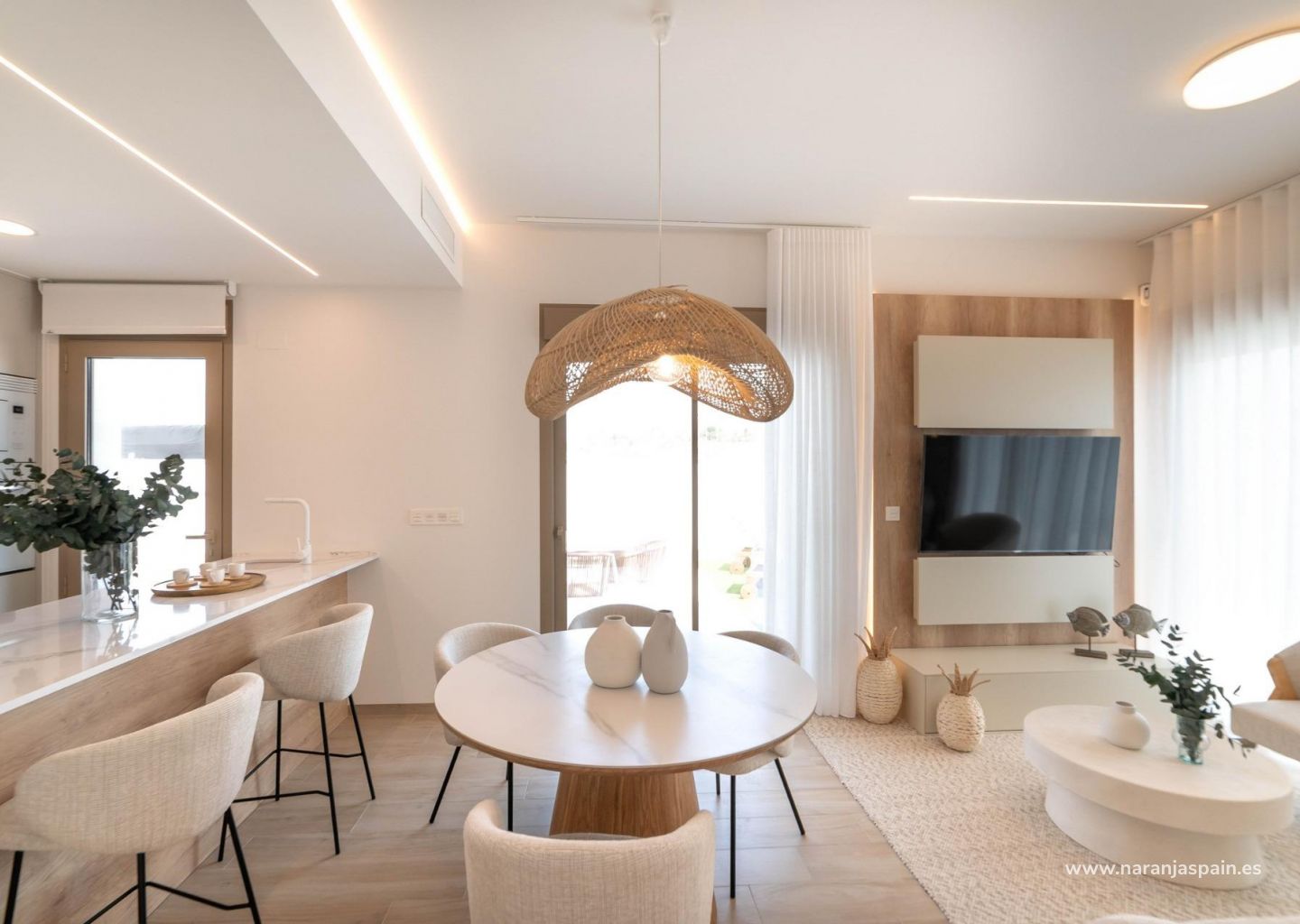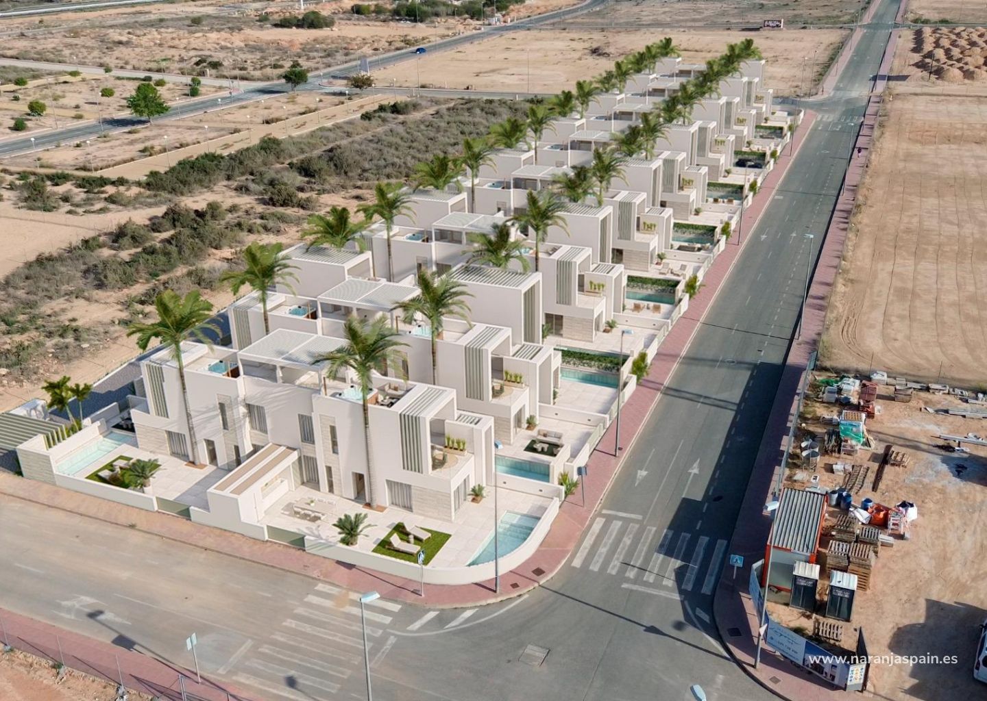 Moderne eiendommer har 3 soverom, 2 bad, gjestetoalett, åpen kjøkkenløsning med stue, garderober, solarium, privat hage med basseng og parkeringsplass utenfor veien.