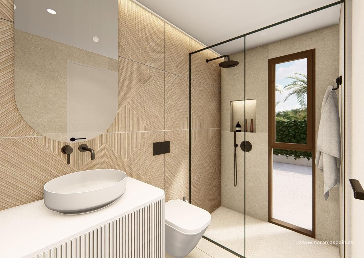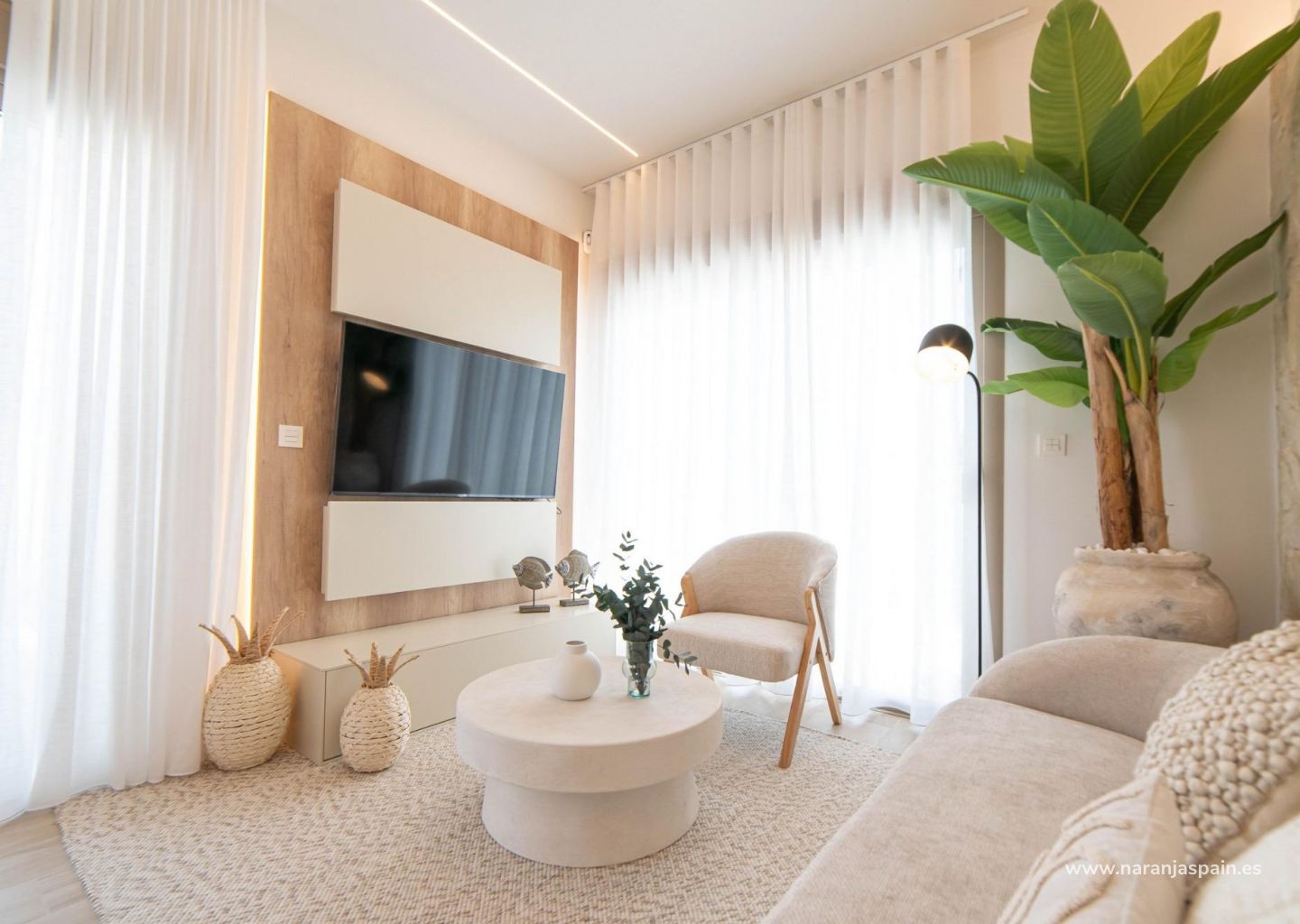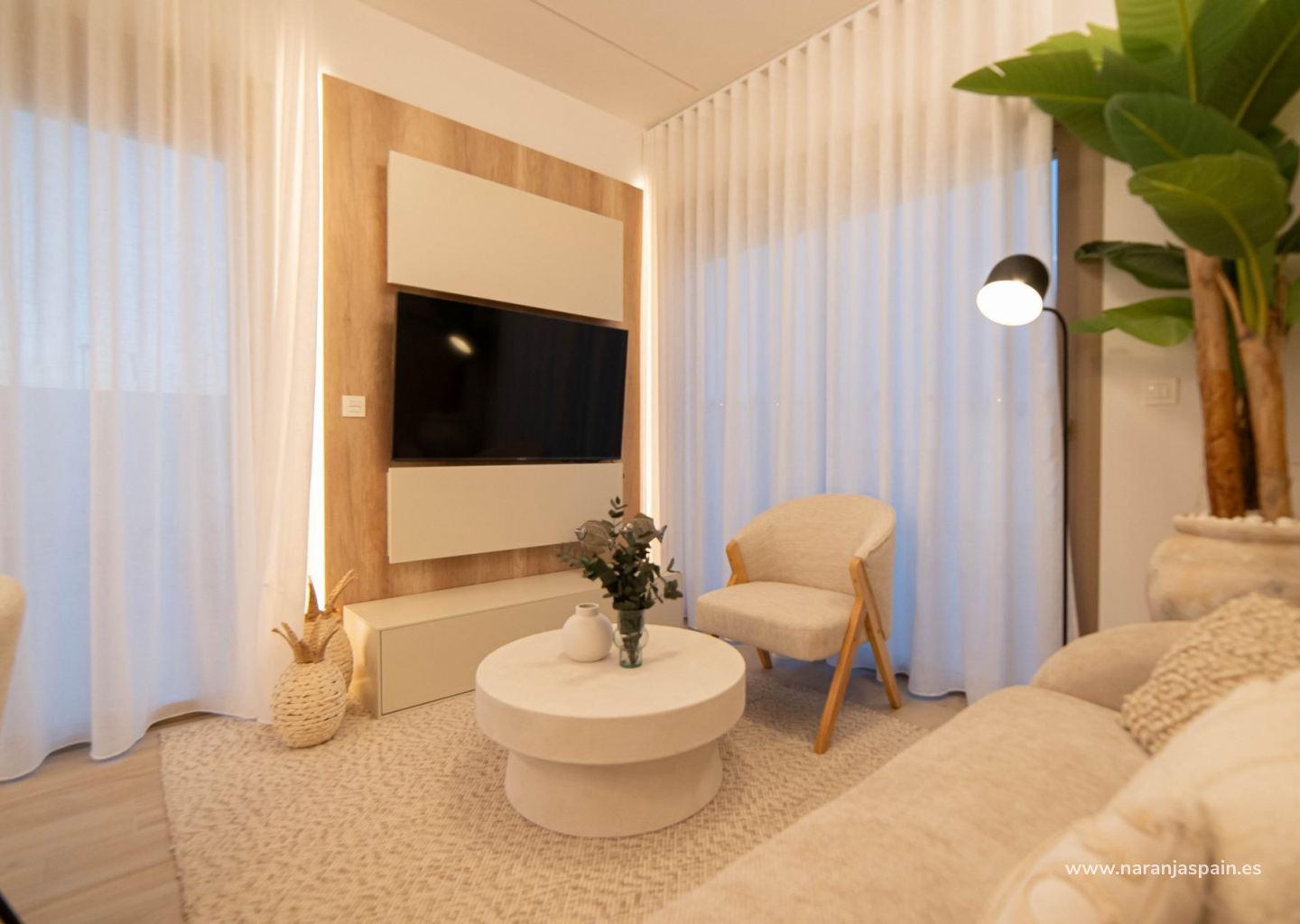 Moderne eiendommer har 3 soverom, 2 bad, gjestetoalett, åpen kjøkkenløsning med stue, garderober, solarium, privat hage med basseng og parkeringsplass utenfor veien.