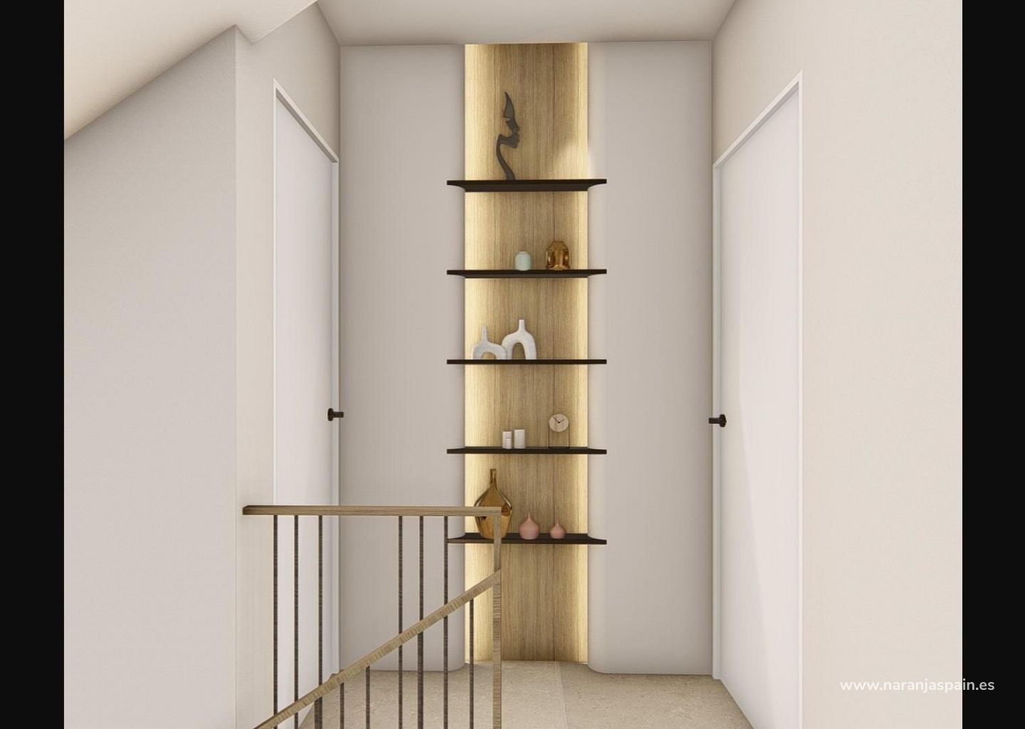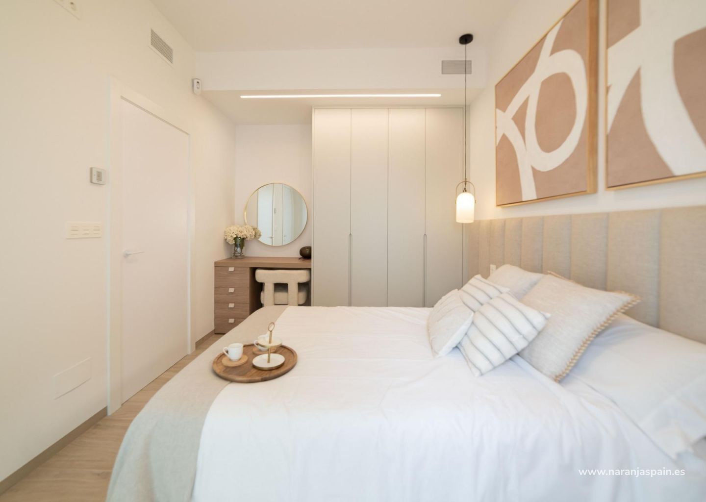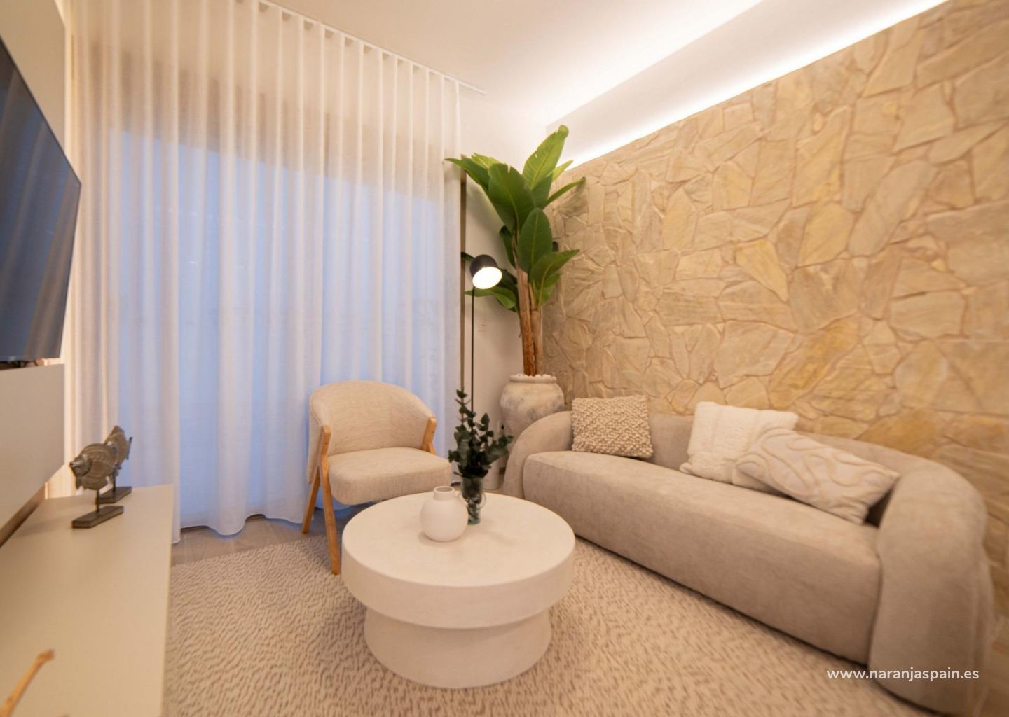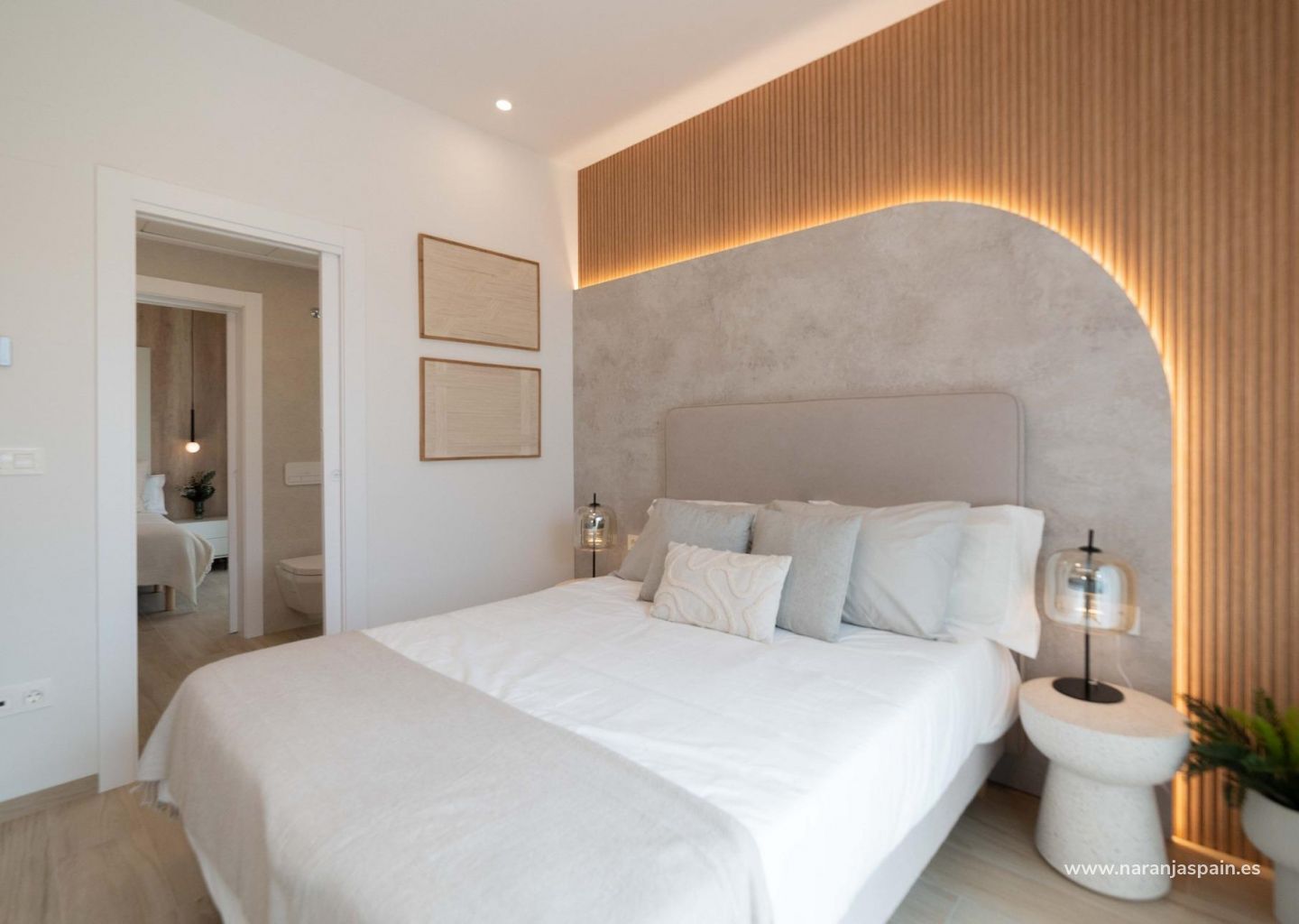 Moderne eiendommer har 3 soverom, 2 bad, gjestetoalett, åpen kjøkkenløsning med stue, garderober, solarium, privat hage med basseng og parkeringsplass utenfor veien.