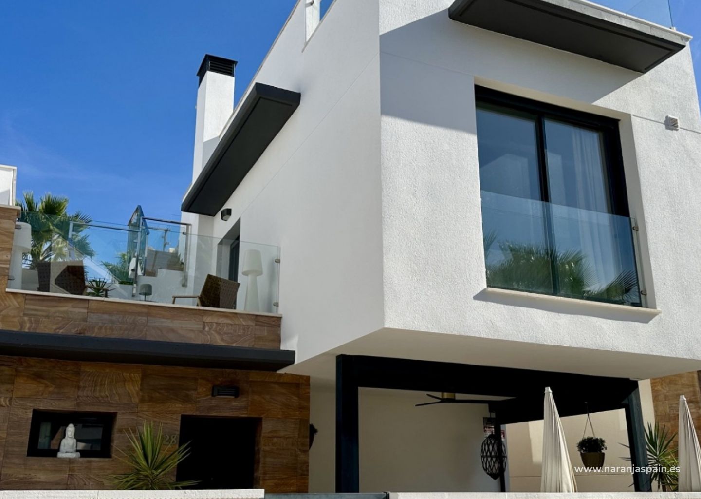 Villaen strekker seg over to etasjer med 128 m² boareal. Den har en åpen stue og spisestue, et fullt utstyrt moderne kjøkken og tre store soverom, inkludert to med eget bad. Alle soverommene har innebygde garderober og rikelig med naturlig lys.
