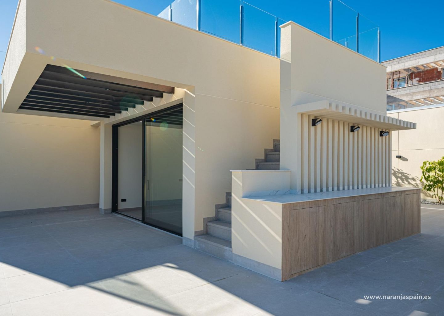 Solariet på taket gir et stort uteområde med panoramautsikt over havet og er forberedt for fremtidig installasjon av solcellepaneler. Et utekjøkken, flere oppbevaringsskap og en hage i middelhavsstil med automatisk vanning fullfører eksteriøret.