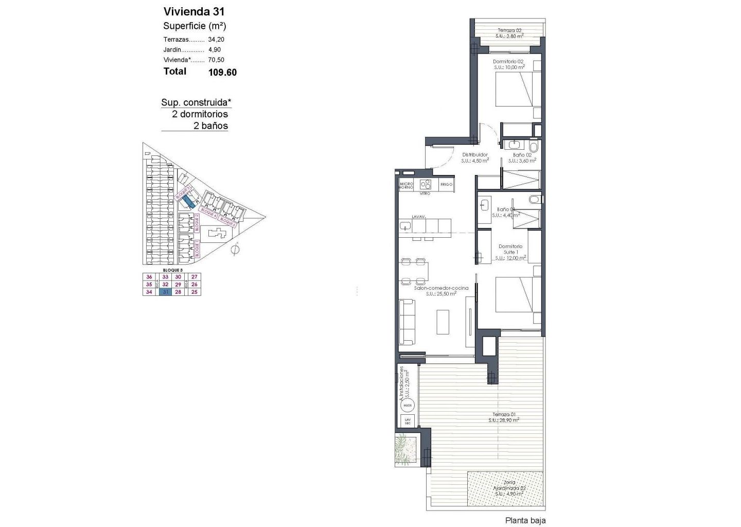 Nybyggede ferieboliger ved La Serena Golf-Los Alcazares nær stranden Moderne golfboliger på Costa Calida Oppdag dette eksklusive nybyggede ferieanlegget ved La Serena Golf i Los Alcazares. Dette moderne anlegget består av 66 stilfulle leiligheter med 2 eller 3 soverom og 2 bad, hvorav ett er en suite, designet for å tilby komfort, eleganse og en eksepsjonell middelhavsstil bare 300 meter fra Mar Menor. Los Alcazares er en sjarmerende kystby kjent for sin avslappede atmosfære, sandstrender og lange strandpromenade. Med mer enn 300 soldager i året tilbyr området et perfekt miljø for friluftsliv, vannsport og golf. Byen har også et bredt utvalg av restauranter, butikker, marinaer og idrettsanlegg, noe som gjør den til et svært attraktivt reisemål både for permanent opphold og ferieboliger. Leiligheter med terrasser, hager og private solterrasser Boligkomplekset tilbyr flere typer eiendommer som passer til forskjellige livsstiler. Kjøpere kan velge mellom leiligheter i første etasje med private hager, leiligheter i mellomste etasje med romslige terrasser eller penthouse-leiligheter med terrasser og store solterrasser på taket. Solariumene har utendørs dusj og mulighet for å legge til et sommerkjøkken og privat boblebad, noe som skaper et ideelt sted for avslapning og underholdning mens man nyter den åpne utsikten over golfbanen og det omkringliggende landskapet. Hver bolig er designet med lyse interiører og åpne oppholdsrom som smelter sømløst sammen med uteområdene. Fasiliteter i resort-stil og eksepsjonelle fellesarealer Et av de mest karakteristiske trekkene ved dette prosjektet er dets resort-stil-konsept. Beboerne kan nyte et spektakulært lagune-stil svømmebasseng på ca. 190 m2 med strand-stil tilgang og avslapningsområder med balinesiske senger. Ytterligere fellesfasiliteter inkluderer anlagte hager, et spa-område, treningsstudio og badstue i kjelleren. Komplekset tilbyr også en lekeplass, to petanque-baner og felles toaletter i nærheten av bassengområdet, noe som skaper et innbydende miljø for beboere og gjester. Kvalitetsfinish og moderne funksjoner Leilighetene er bygget med moderne materialer og høykvalitets spesifikasjoner designet for komfort og stil. Fullt utstyrt kjøkken med hvite glassfinish apparater Bad med servantskap, dusjvegger og bakgrunnsbelyste speil Motoriserte vinduslemmer Grunnleggende belysningspakke Fullt installert kanalisert klimaanlegg Underjordisk parkeringsplass for hver eiendom Underjordisk sykkelparkering og valgfrie oppbevaringsrom Førsteklasses beliggenhet nær strand og golf Mar Menor-stranden 0,3 km La Serena Golf ved siden av boligkomplekset Los Alcazares sentrum 2 km Cartagena 22 km Murcia 40 km Region de Murcia internasjonale lufthavn 30 km Alicante Elche lufthavn 90 km Det rolige og grunne vannet i Mar Menor er ideelt for svømming, seiling og paddle surfing hele året. Sikre deg ditt hjem på La Serena Golf Resort Disse moderne leilighetene kombinerer strandliv, utsikt over golfbanen fra de fleste enhetene og fasiliteter i resort-stil i et av de mest attraktive områdene på Costa Calida. Kontakt oss i dag for å få mer informasjon eller avtale et besøk, og sikre deg ditt nye hjem i La Serena Golf-Los Alcazares.