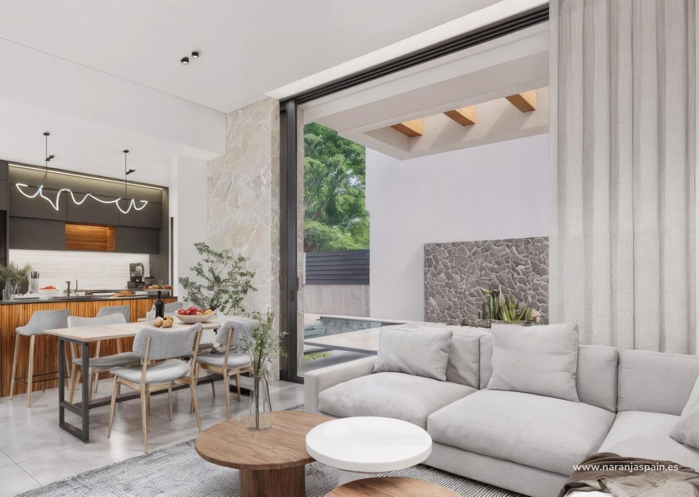 Første etasje har en åpen stue med fullt integrert kjøkken og direkte tilgang til hagen og bassengområdet. Denne etasjen har også to soverom, et komplett bad og et praktisk vaskerom.