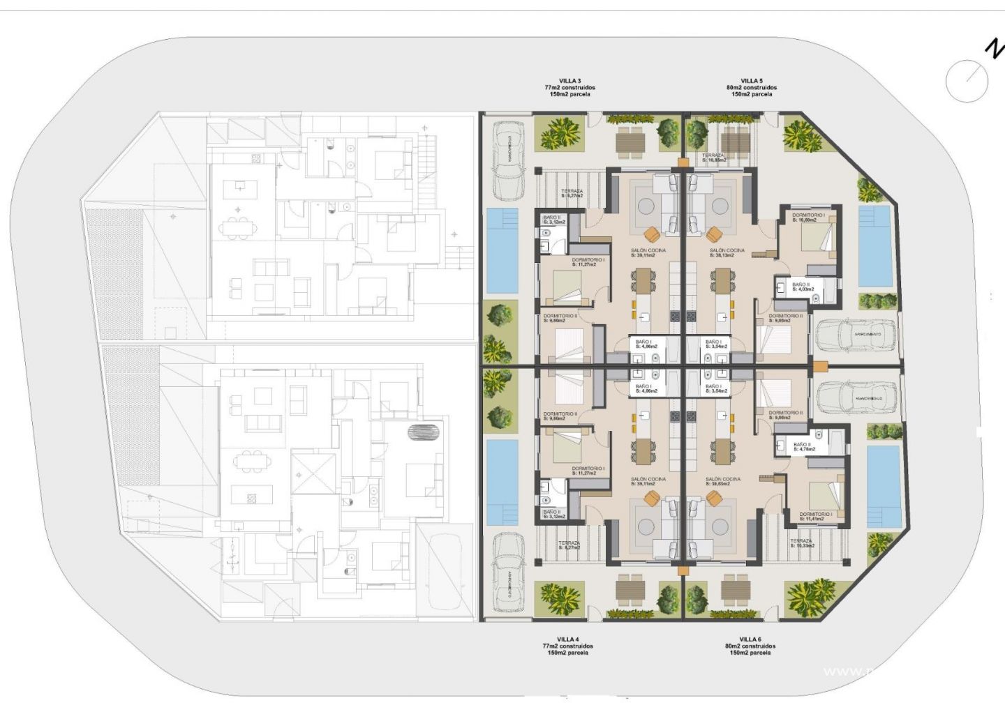 Disse moderne villaene er i én etasje og har 2 soverom og 2 bad, hvorav det ene er en-suite. Hver bolig har et åpent kjøkken og stue, designet for å maksimere naturlig lys og komfort. Hjørnetomtene har en privat hage med svømmebasseng og parkeringsplass.