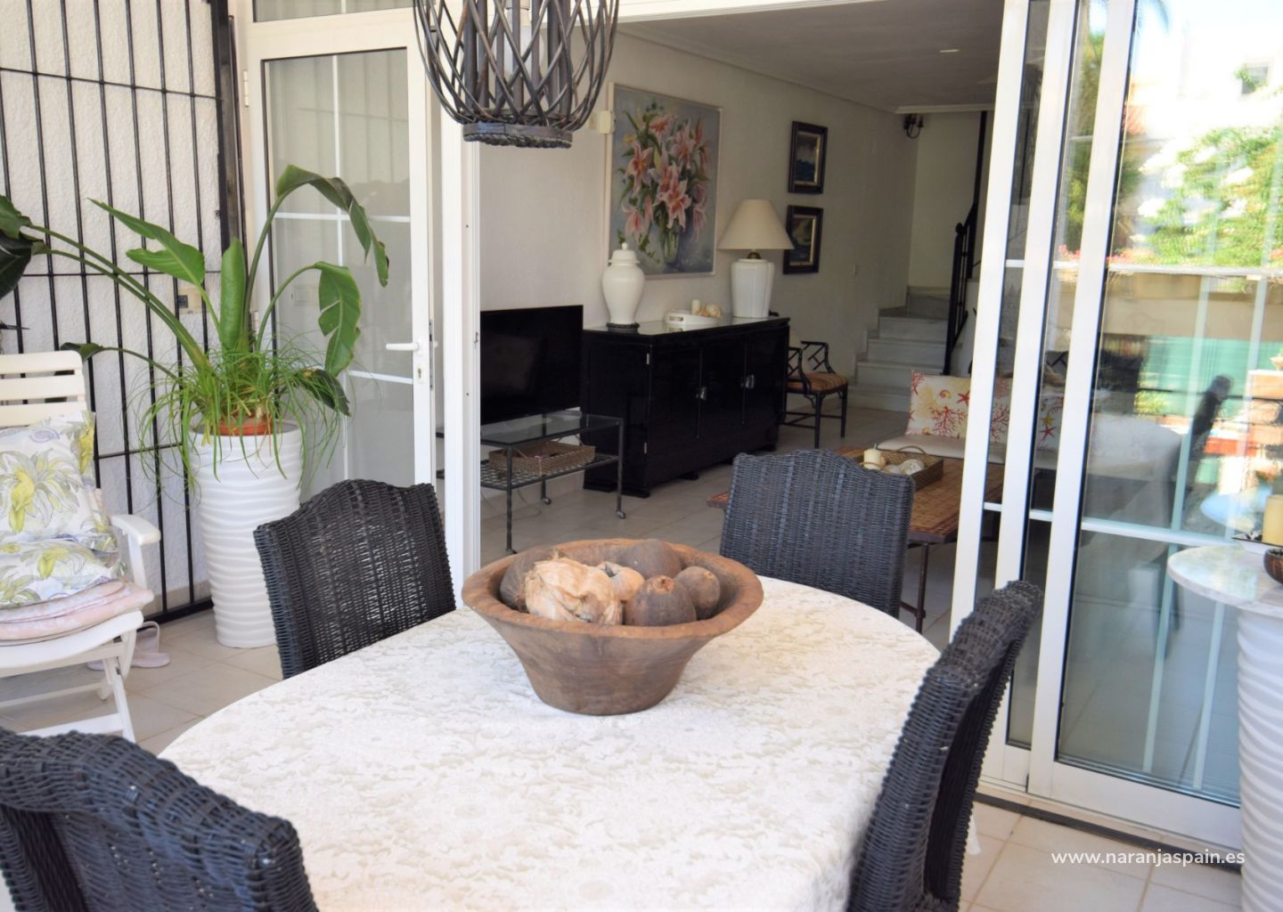 Tiene 3 dormitorios, 2 baños, gran salón-comedor muy luminoso con salida a dos bonitas terraza y una de ellas con barbacoa, amplia cocina independiente con salida a la zona comunitaria. En la planta de arriba hay otra terraza con vistas al mar. Orientación este. Zona muy tranquila y es ideal para cualquier época del año.
