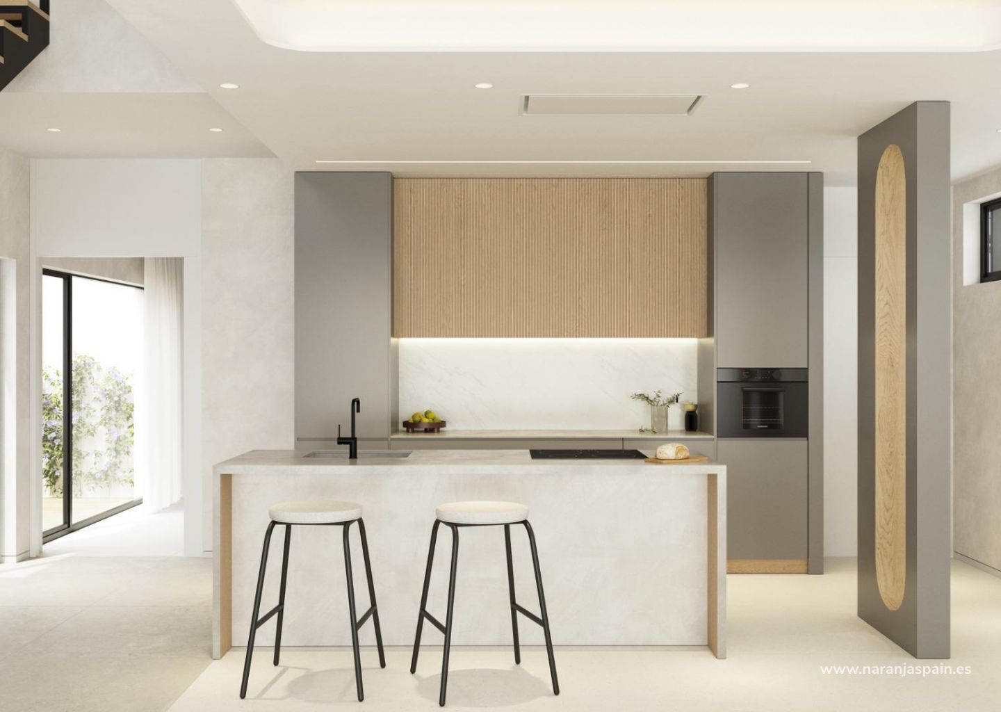 Villas con 3 dormitorios y 3 baños, cocina americana con salón, terraza con magníficas vistas sobre Benidorm, jardín privado con piscina y plaza de aparcamiento.