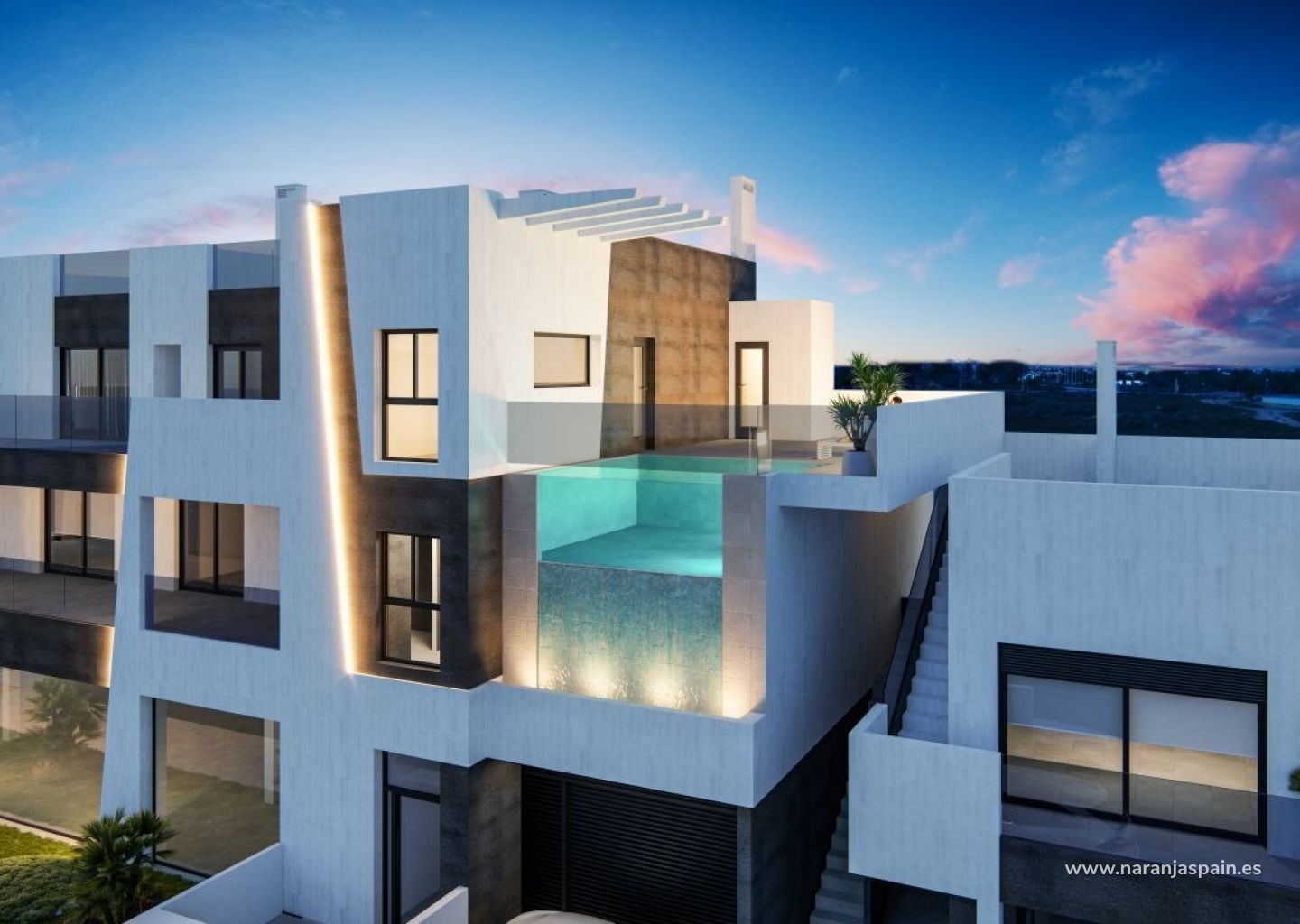 También cuenta con una impresionante piscina en la azotea y plazas de garaje en el sótano.