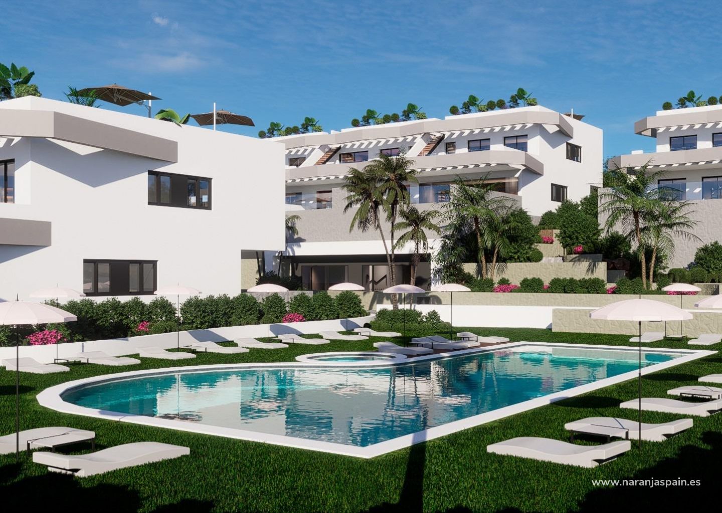 Bungalows en planta alta con solarium privado y bungalows en planta baja con jardín privado y posibilidad de piscina privada con coste adicional.