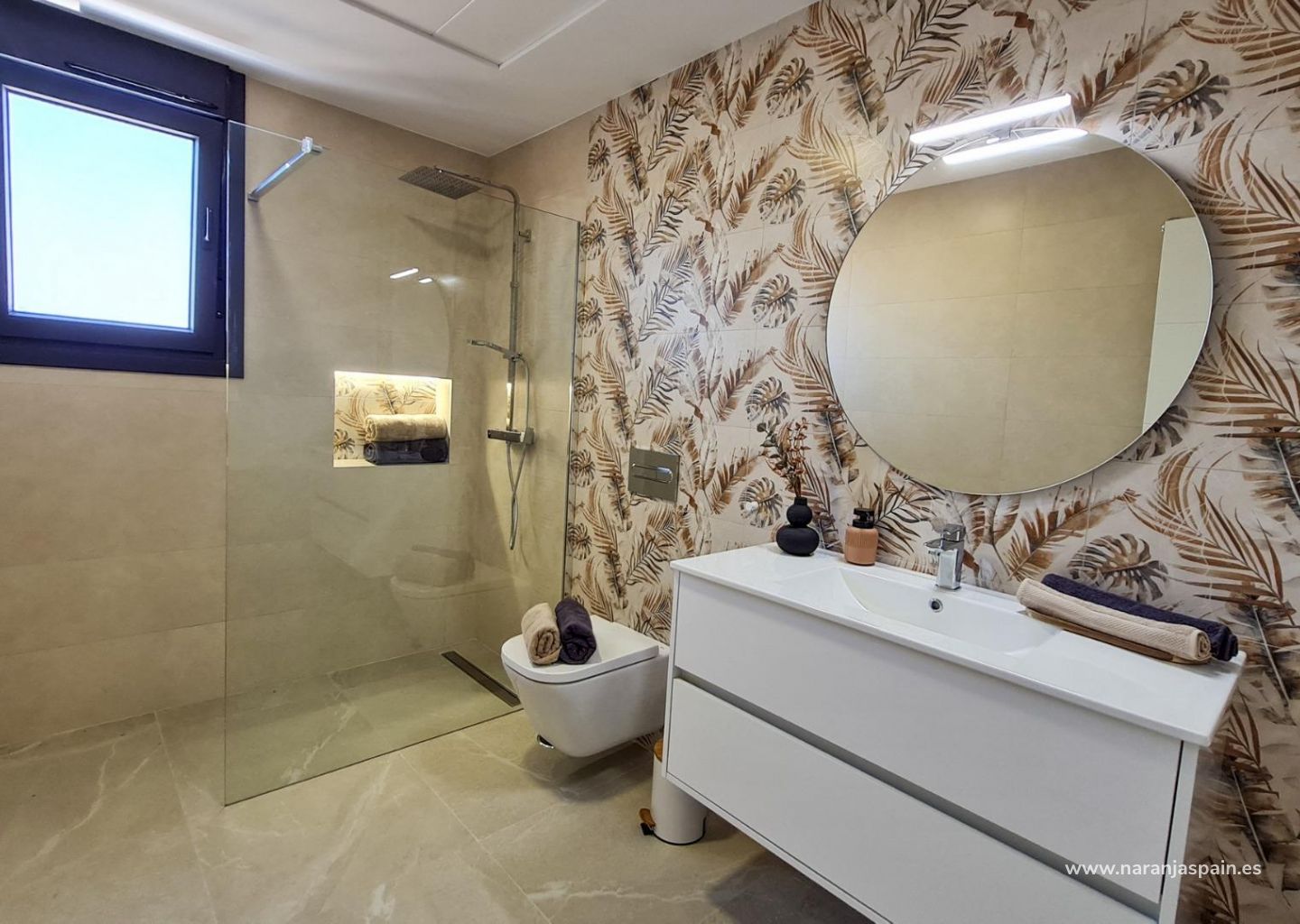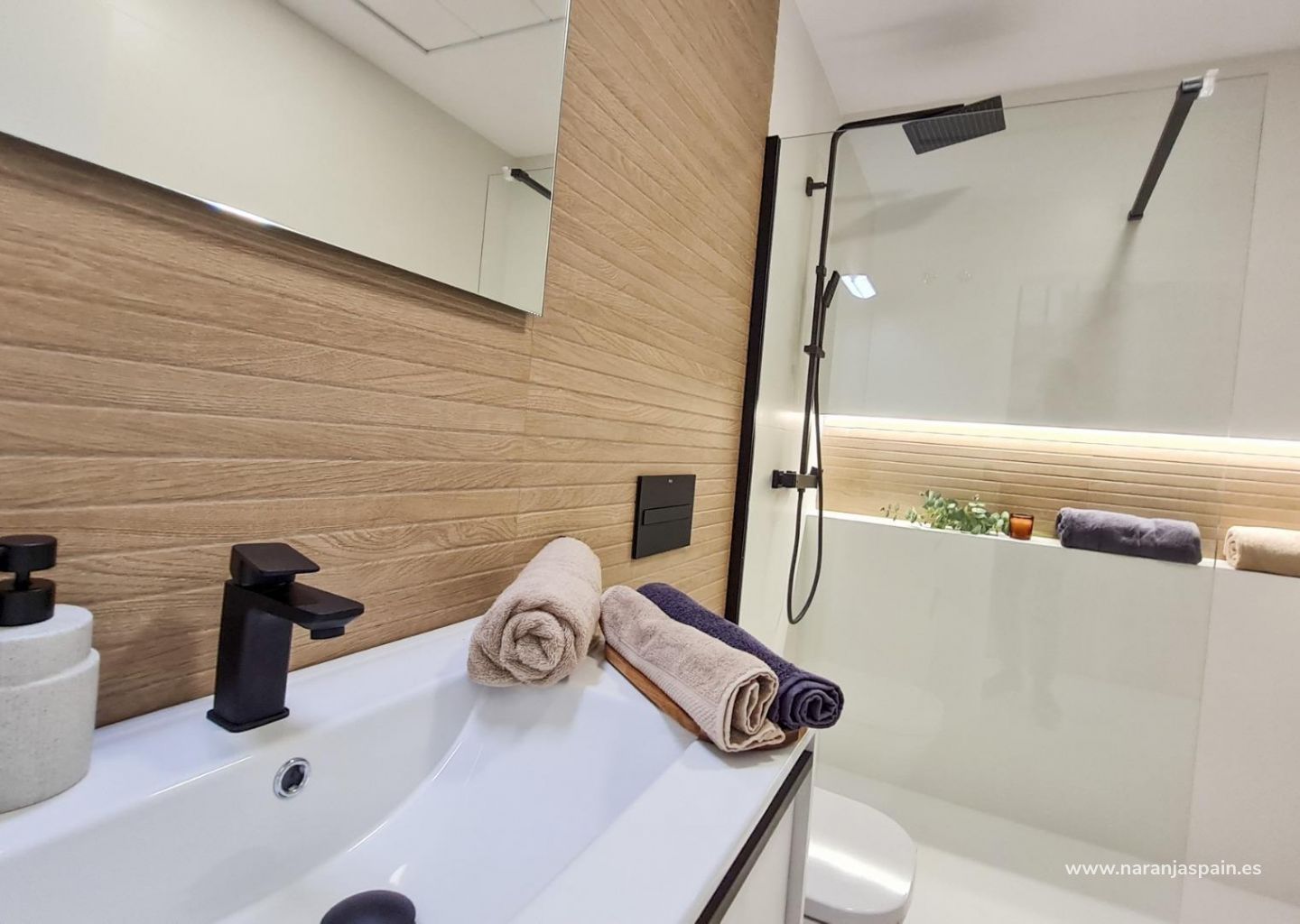Cuartos de baño completos con mueble de lavabo, inodoro suspendido con cisterna incorporada, espejo, ducha con efecto lluvia y mamparas.
