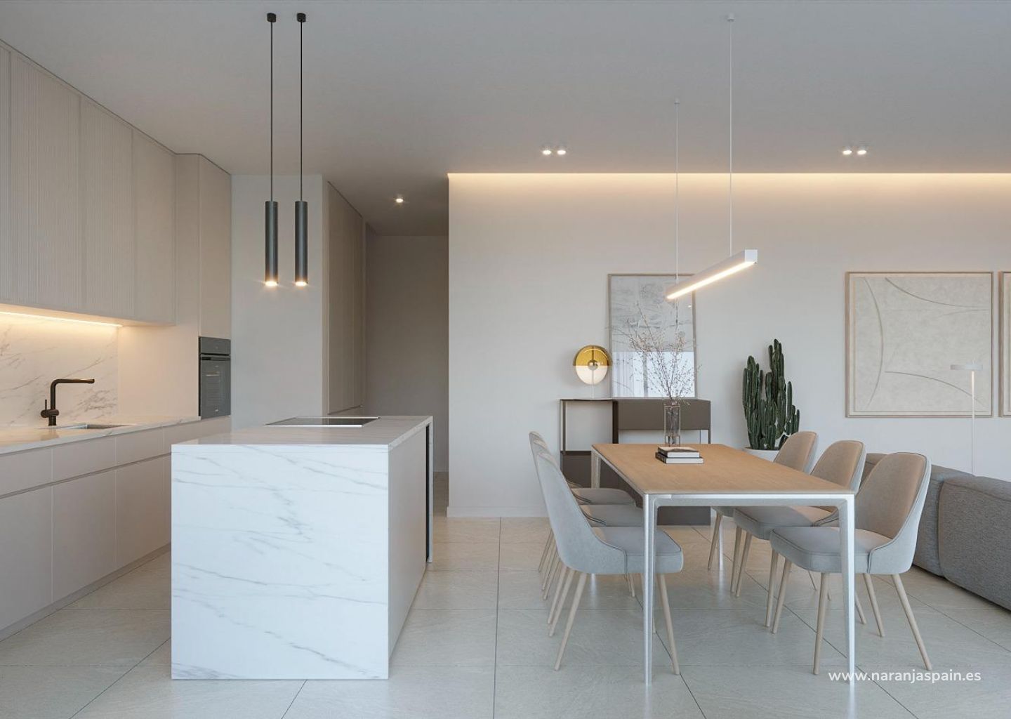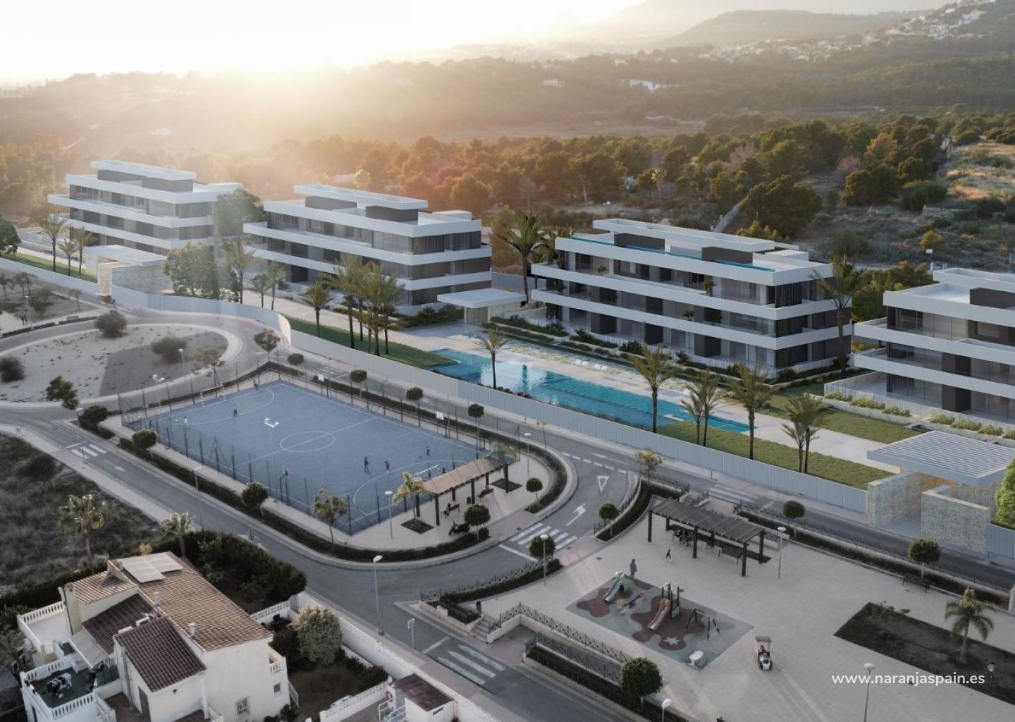 Complejo residencial de obra nueva de apartamentos y áticos con piscina comunitaria exterior, parking, trastero, ascensor, gimnasio, spa comunitario con piscina cubierta climatizada, sauna, jacuzzi en La Nucia.