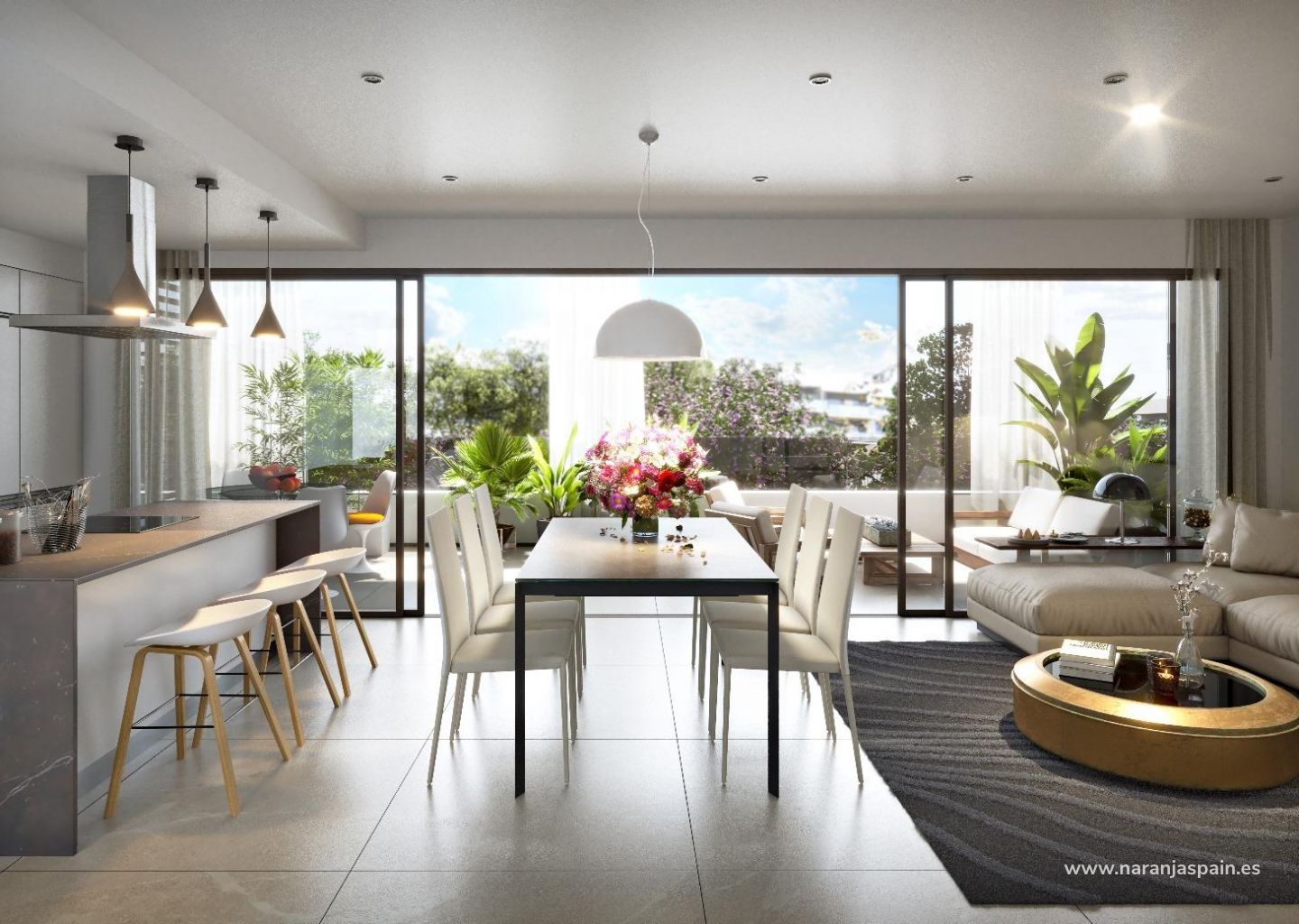 La elegante atemporalidad de sus acabados y la luminosidad que aporta su amplia terraza dotan a la vivienda de profundidad y continuidad con el exterior, creando amplios espacios para el disfrute.