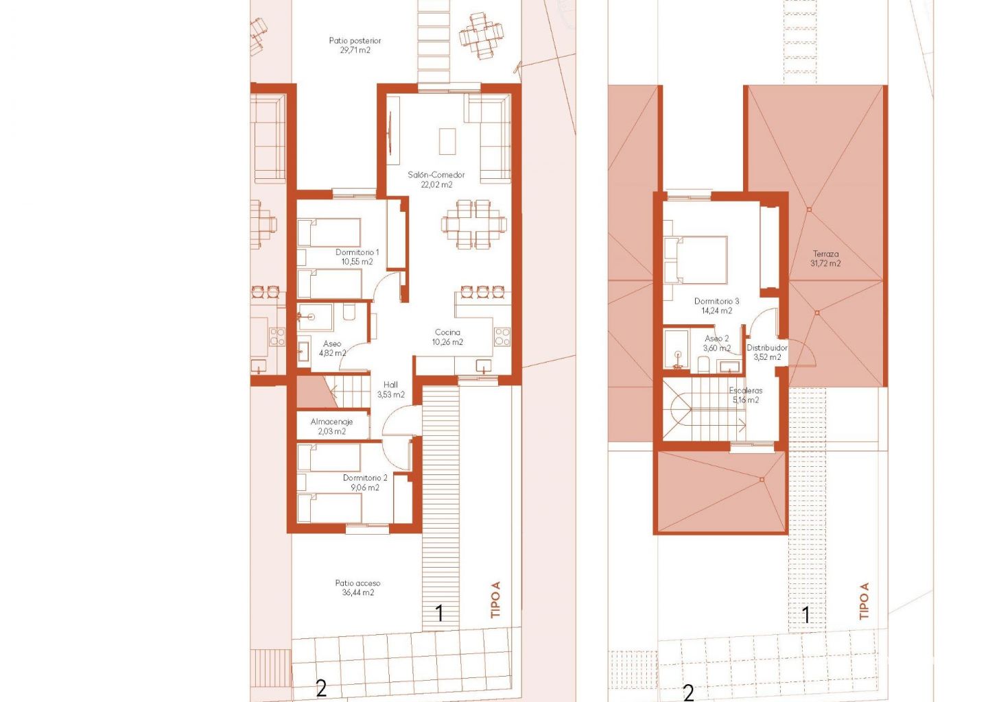 ADOSADOS DE OBRA NUEVA EN ALTAONA GOLF RESORT, MURCIA Residencial de obra nueva de bonitos adosados en Altaona Golf resort, Murcia. Situado en un entorno privilegiado donde podemos vivir tranquilamente, en contacto con la naturaleza y la montaña, conseguimos calidad de vida, aire puro y espacios abiertos. Las hermosas casas adosadas de 2 niveles en Altaona Golf and Country Village son perfectas para abrazar el estilo de vida mediterráneo. Casas soleadas diseñadas con un estilo de vida al aire libre en mente, cuenta con 3 dormitorios, 2 baños, cocina abierta con zona de estar, terrazas, jardines delanteros y traseros con espacio para una piscina. Una opción de piscina privada con un coste adicional. Exclusivo residencial de Obra Nueva situado en Altaona Golf a tan solo 15 minutos en coche del centro de Murcia capital y a 20 minutos de las playas podrá disfrutar de la tranquilidad y seguridad que ofrece el Campo de Golf que cuenta con 18 hoyos y la comodidad de vivir cerca de todos los servicios. El aeropuerto de Murcias Corvera a solo 15 minutos en coche.