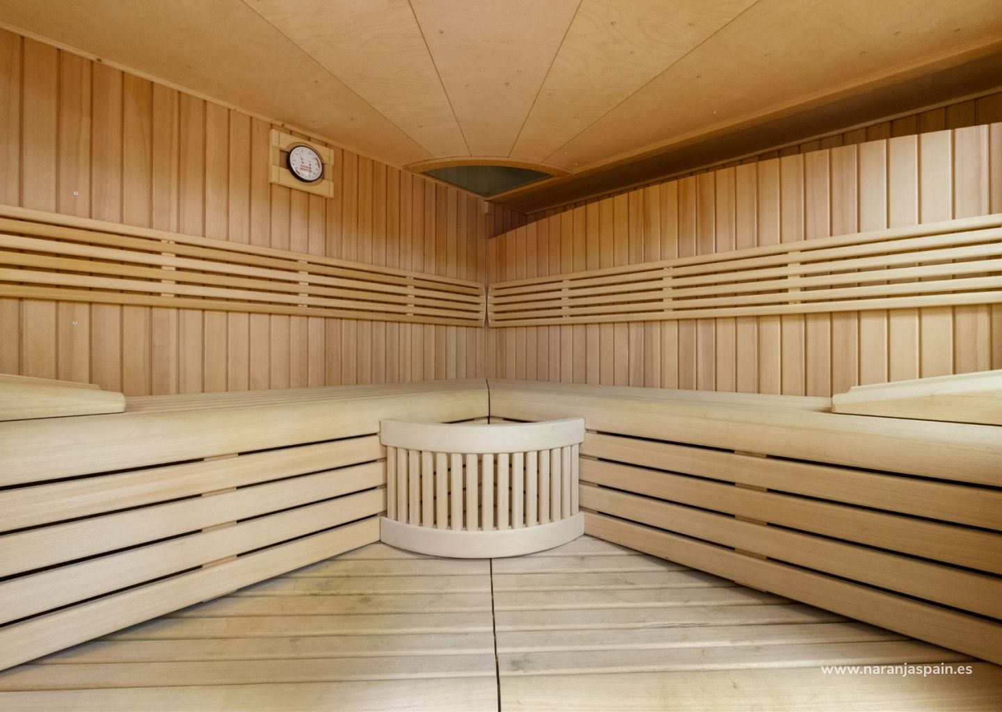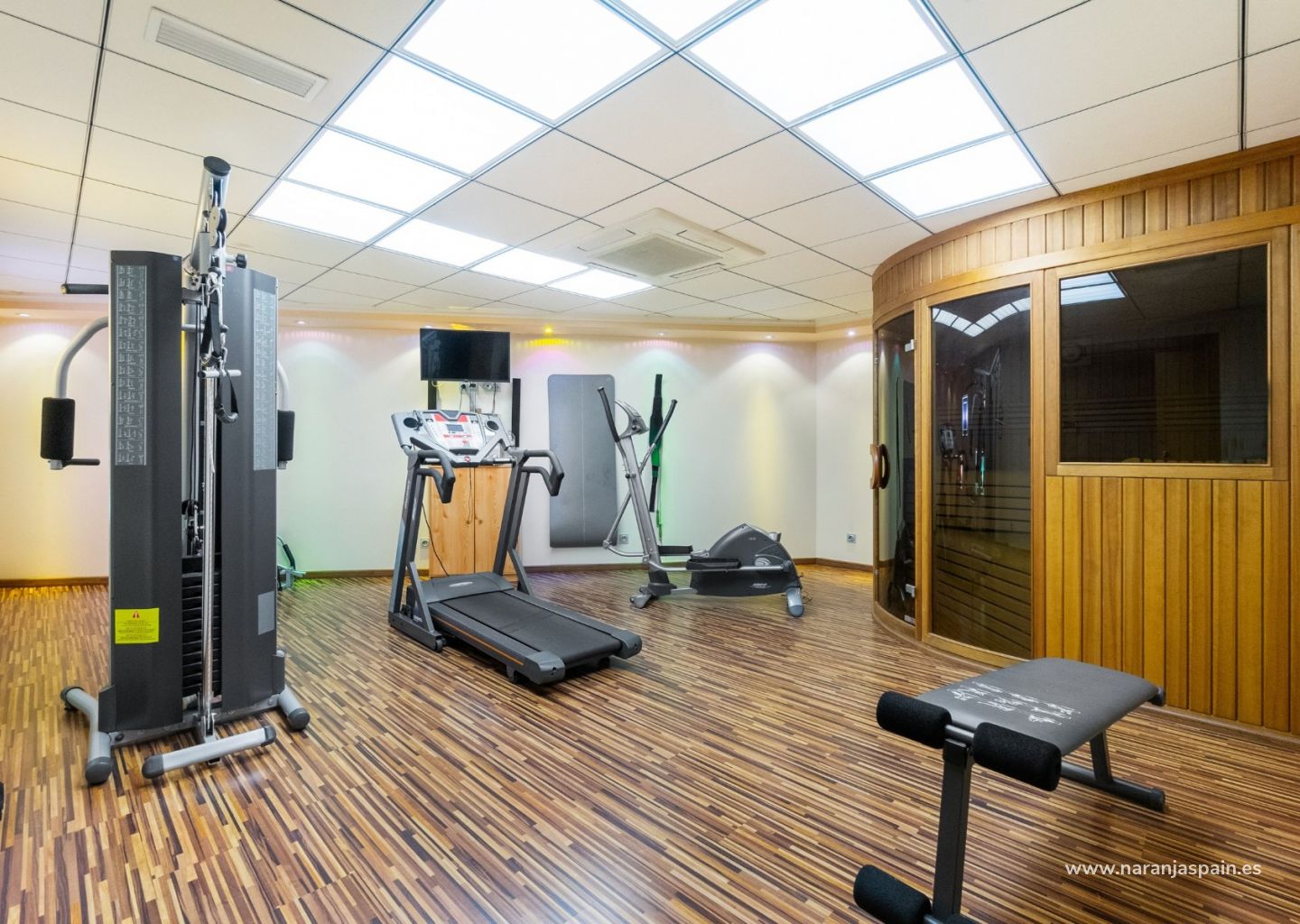 En el sótano hay un gimnasio con sauna finlandesa, con aromaterapia y cromoterapia.